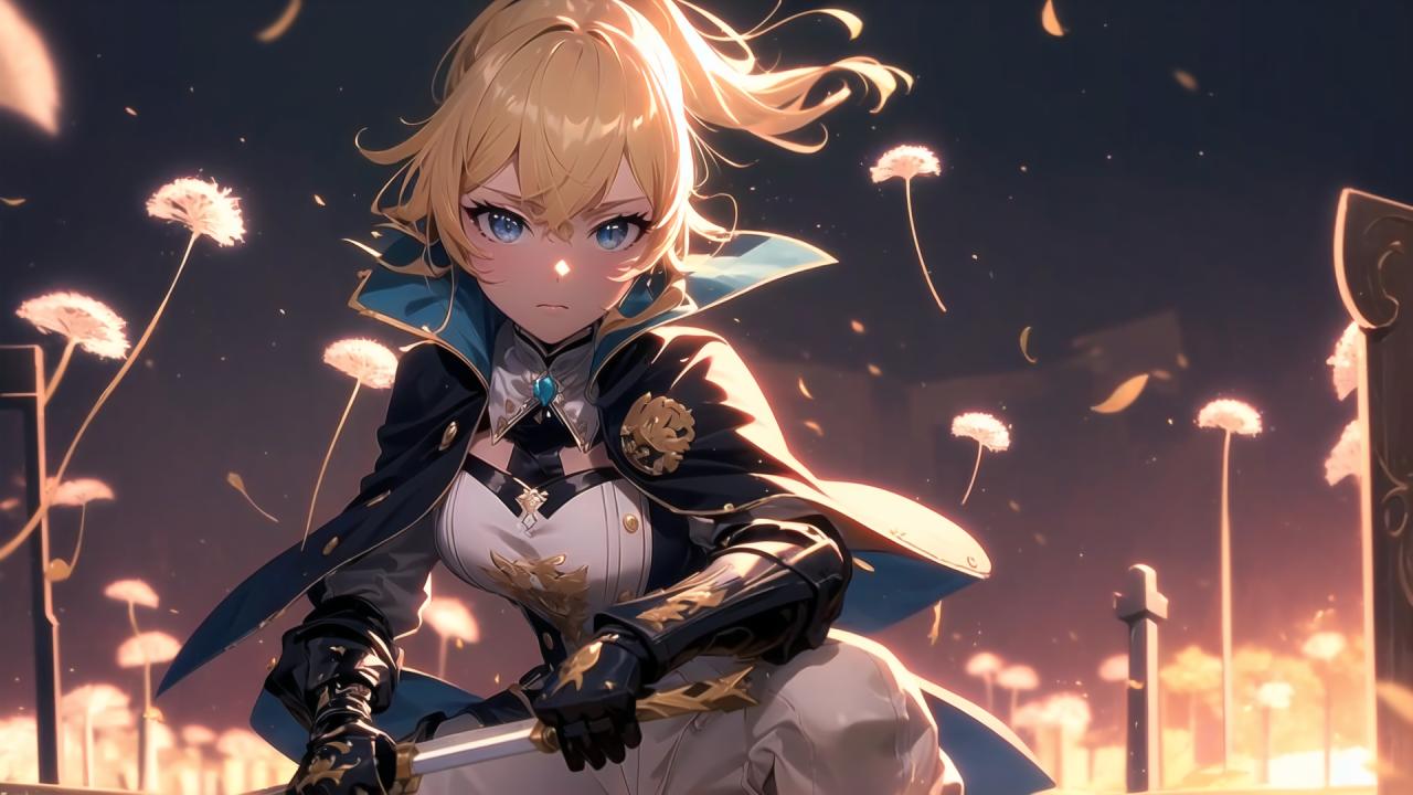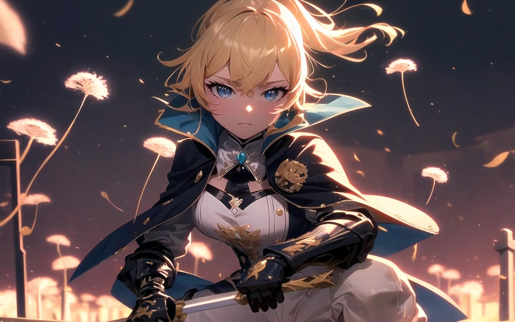 a woman sitting near grass holding a sword looking off into the distance as it is shining behind her head in flames from her eyes and her face is dark skies