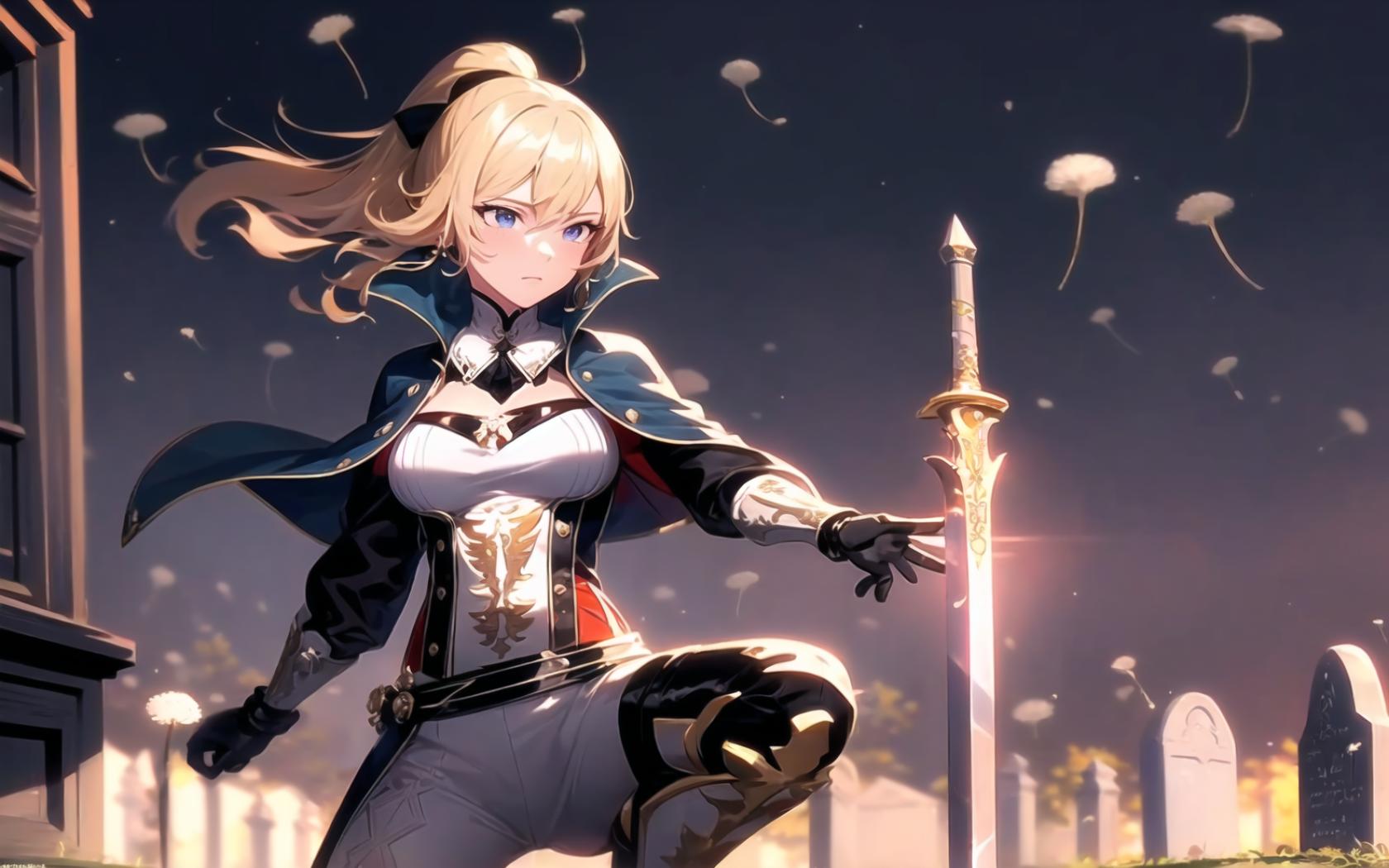1girl, bangs, black gloves, blonde hair, blue capelet, blue eyes, bow, capelet, cleavage, corset, dandelion , gloves, hair bow, large breasts, long hair, pants, ponytail, solo, sword, tight, weapon, white pants
