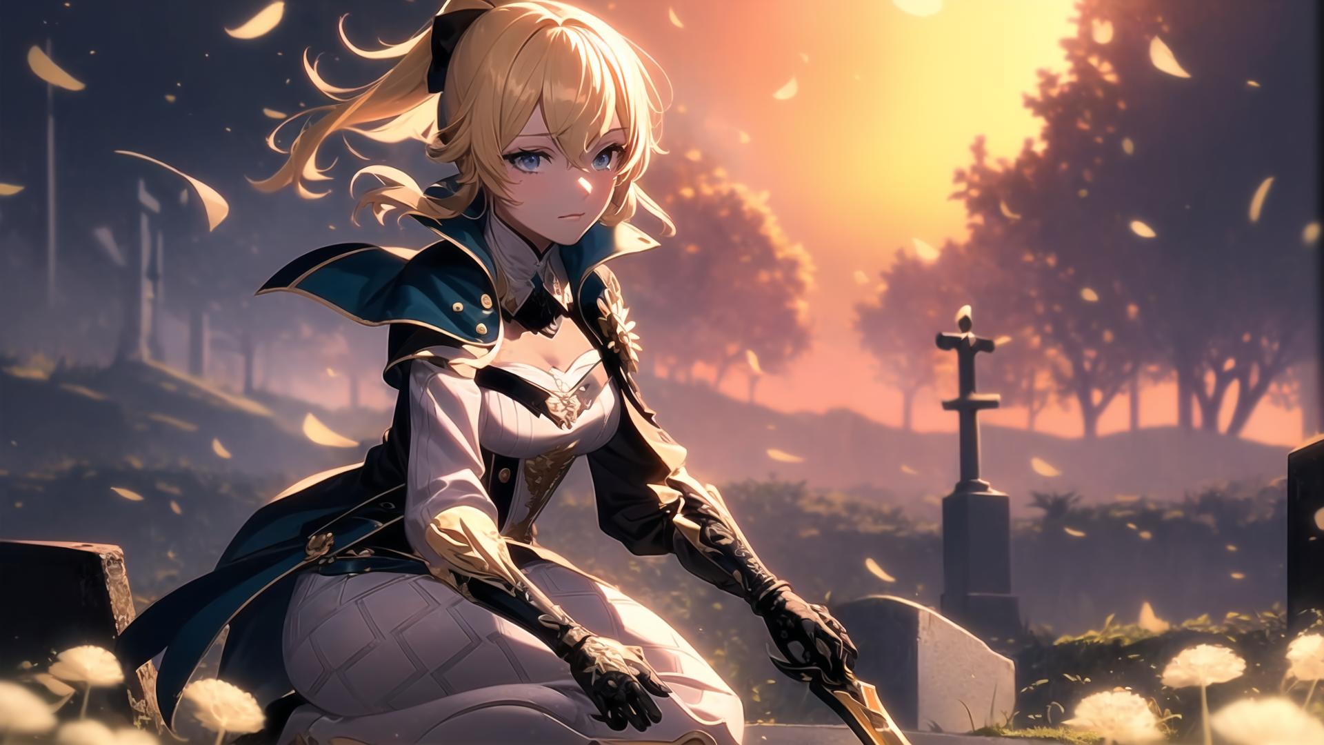 1girl, bangs, blonde hair, blue capelet, blue eyes, bow, capelet, cleavage, closed mouth, corset, dandelion, flower, gauntlets, gloves, grave , graveyard, hair bow, holding, long hair, looking at viewer, medium breasts, outdoors, pants, petals, ponytail, ruins, sidelocks, sitting, solo, sword, tombstone, weapon, white pants