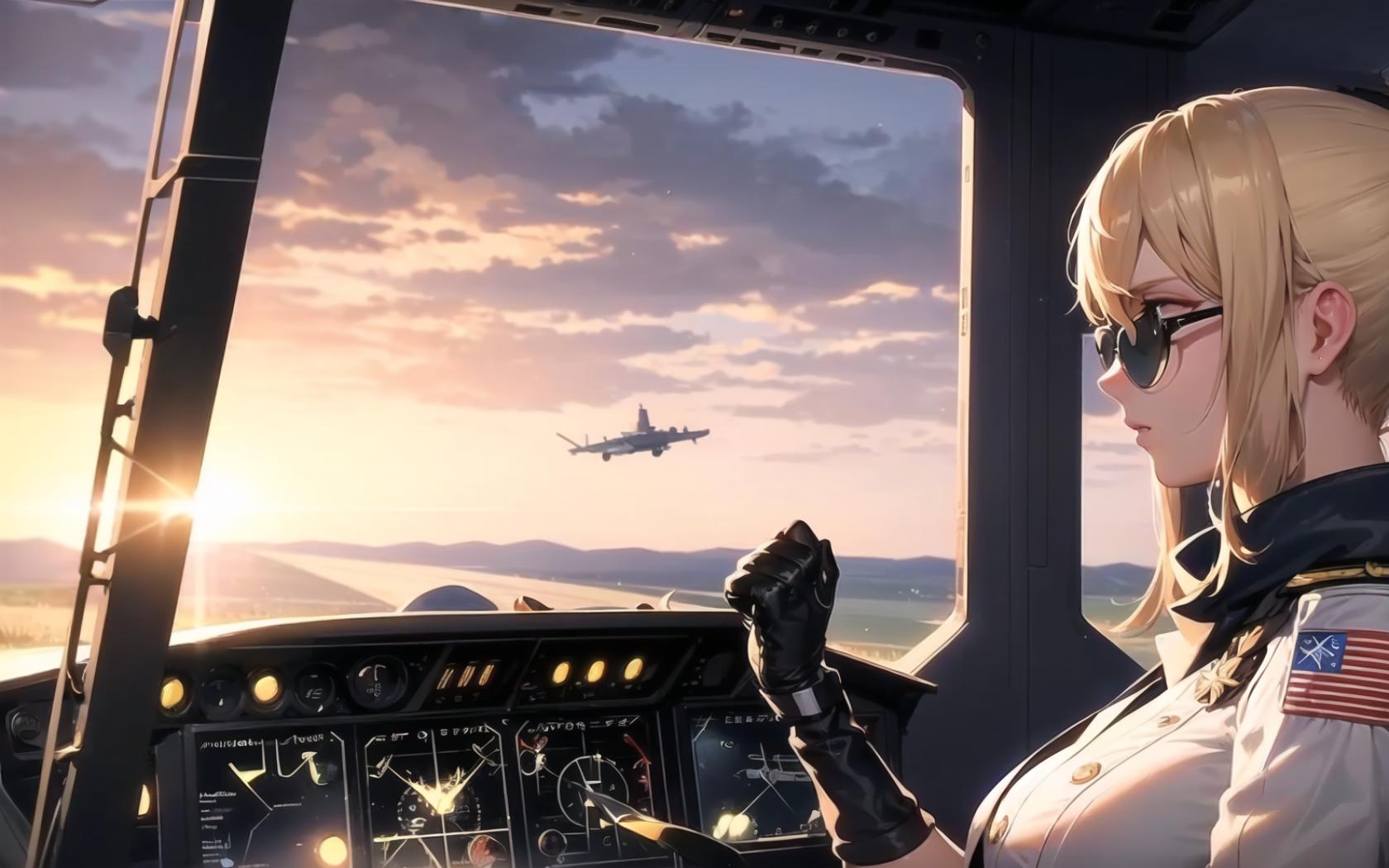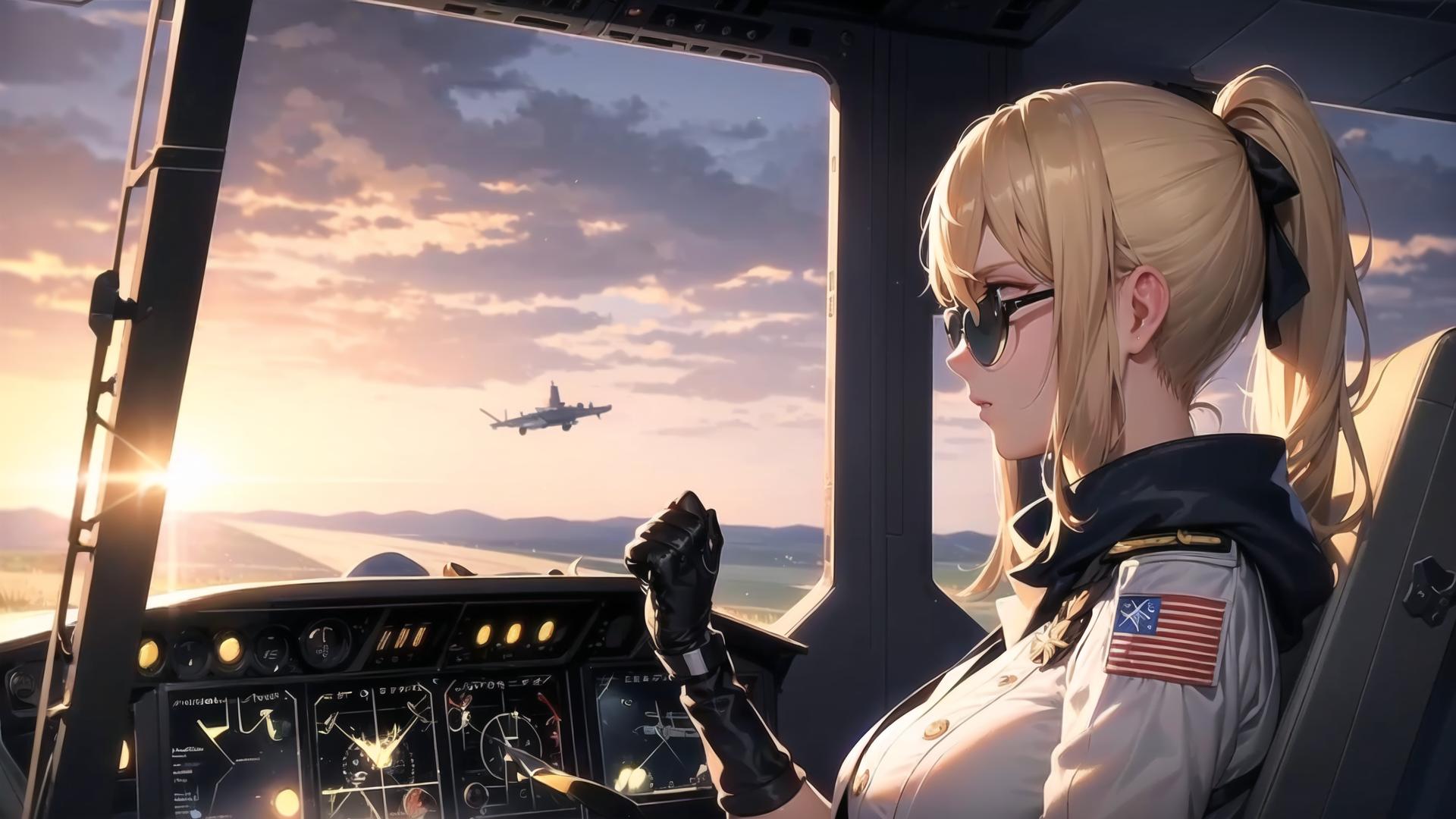 a female jet pilot in a cockpit and piloting an airplane flying overhead at sunrise, with the sun and the sky in background and clouds