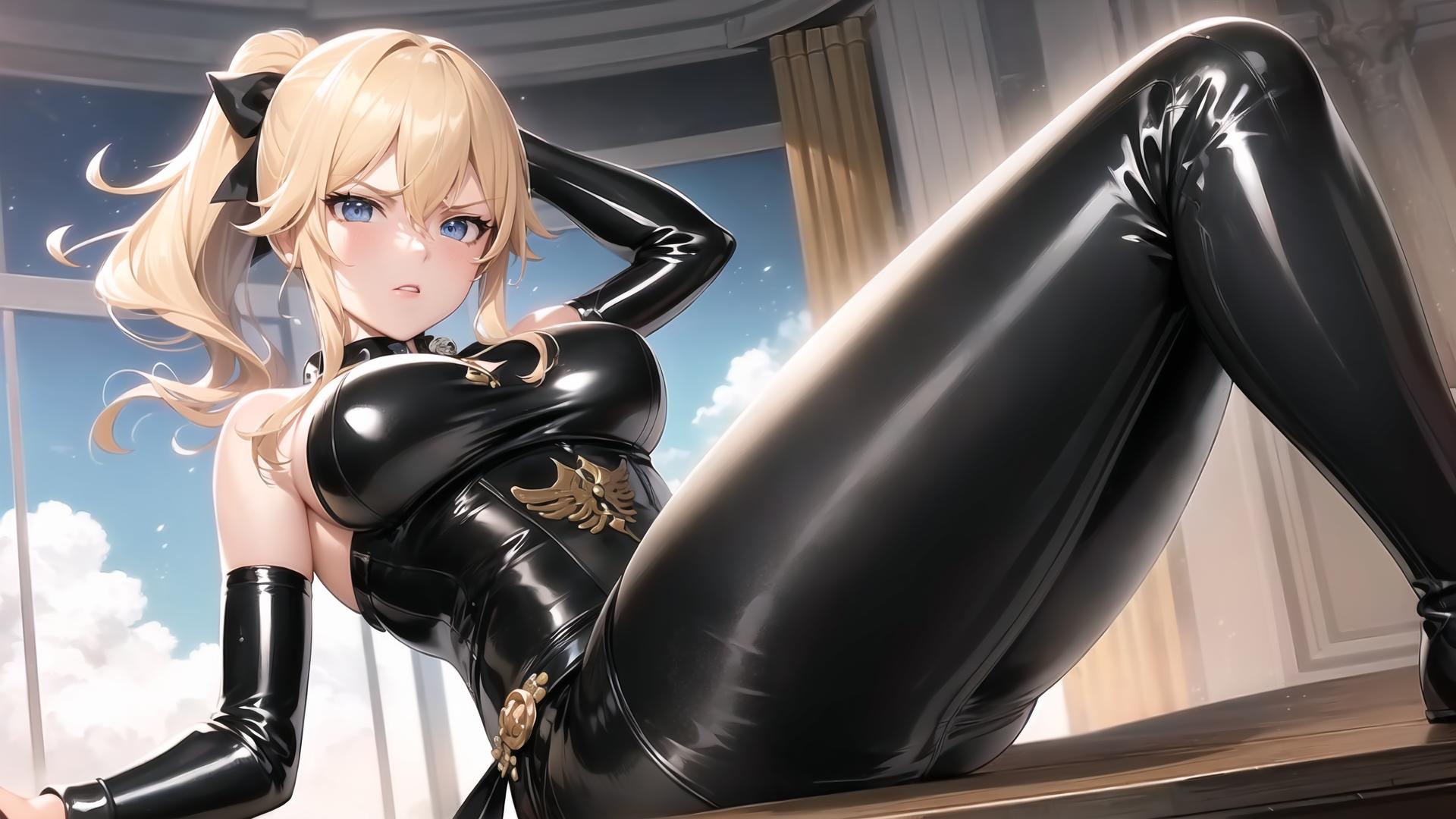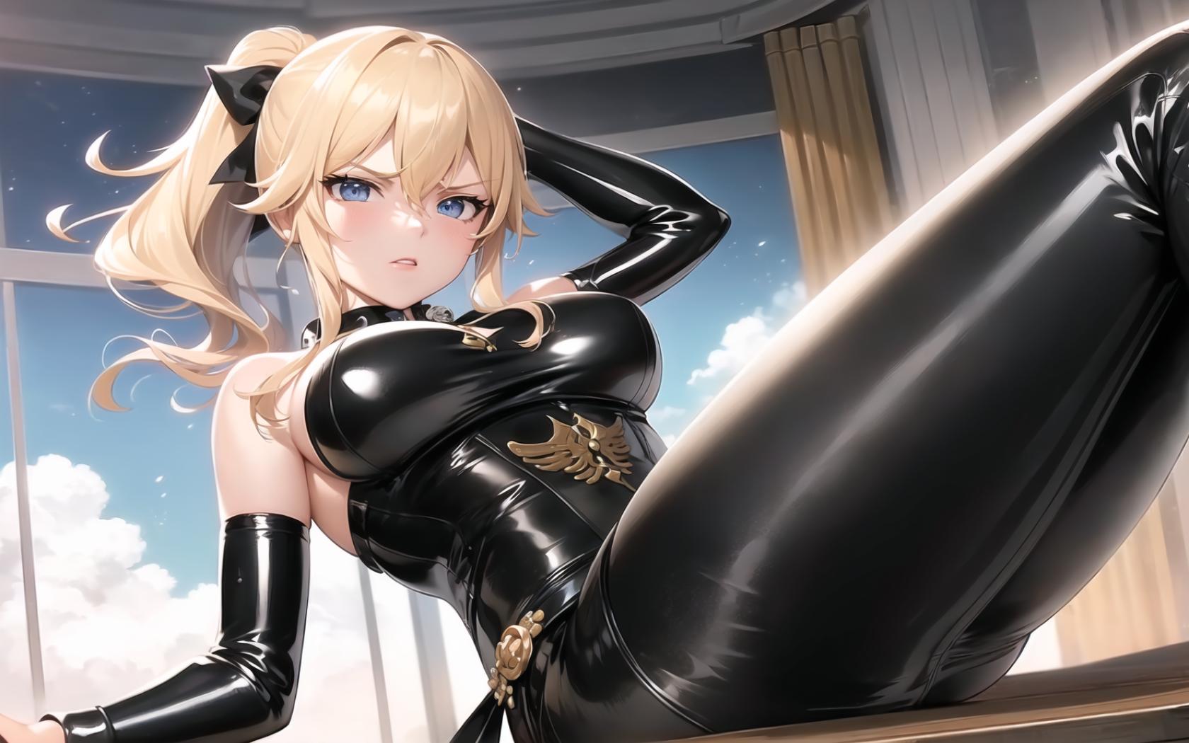 1girl, alternate costume, arm up, bangs, bare shoulders, black bodysuit, black footwear, blonde hair, blue eyes, blush, bow, cross, cross earrings , detached sleeves, dress, earrings, hair between eyes, hair bow, high heels, indoors, jewelry, large breasts, latex, long hair, looking at viewer, parted lips, ponytail, shiny, shiny clothes, sidelocks, sitting, skin tight, sky, sleeveless, solo, window