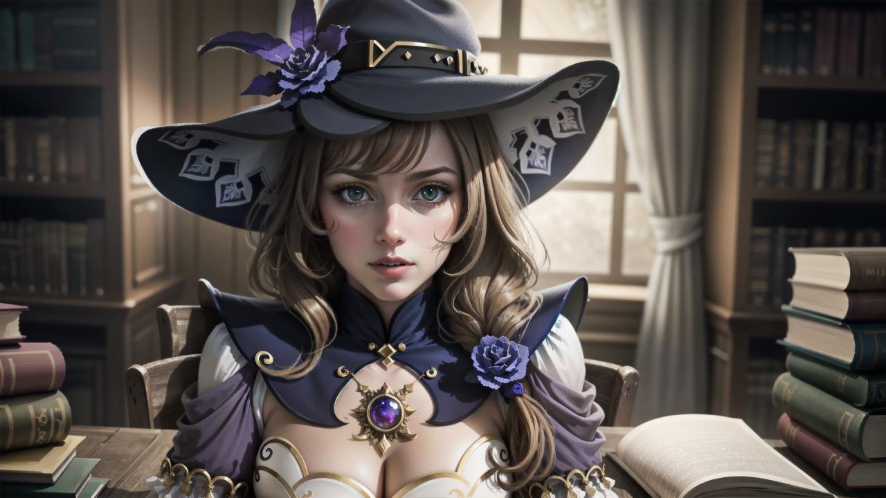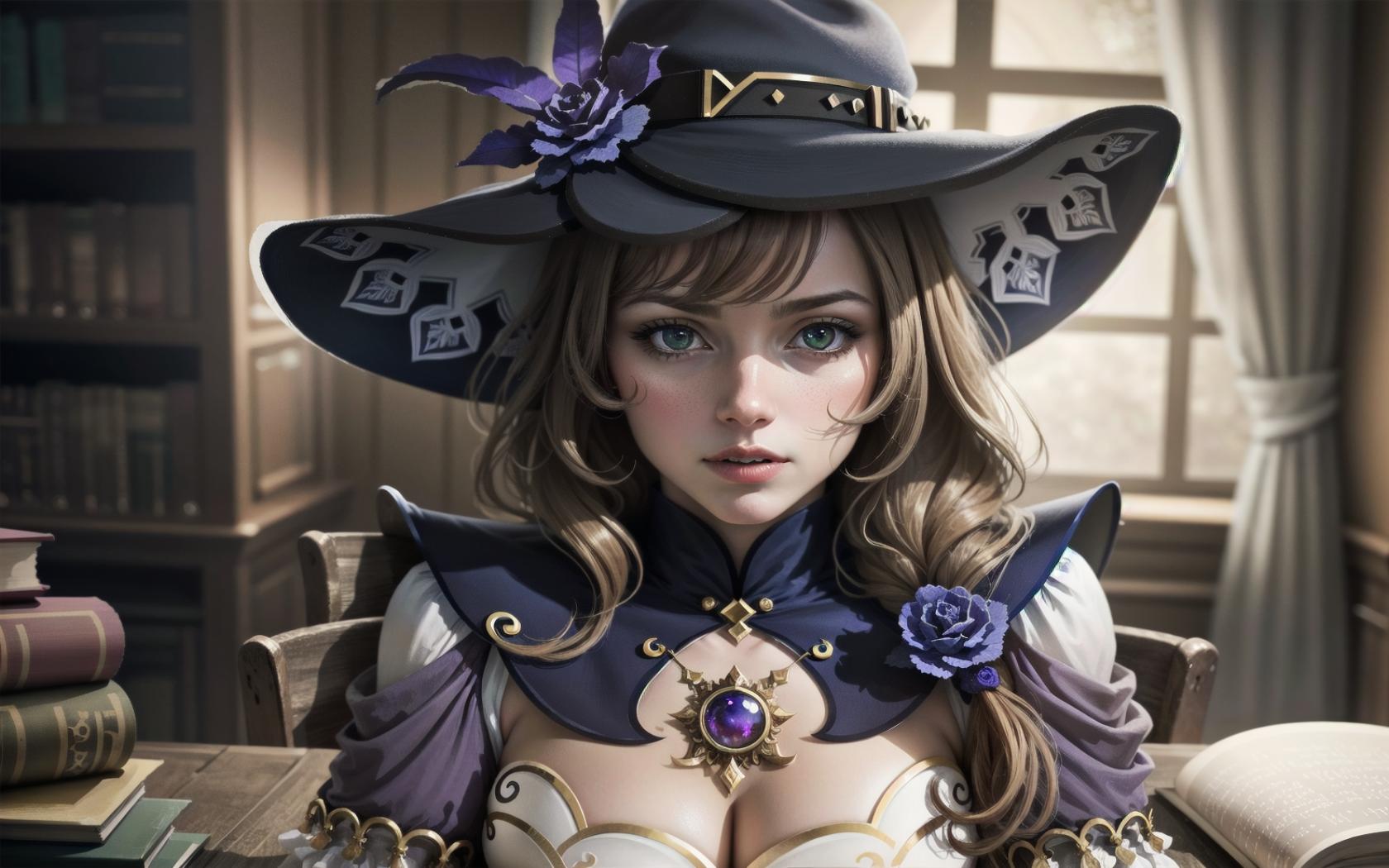 1girl, bangs, book, book stack, bookshelf, brown hair, cleavage, flower, green eyes, hair flower, hair ornament, hair over shoulder, hat, hat flower, indoors, jewelry, large breasts, library, long hair, looking at viewer, parted lips, purple capelet , purple flower, purple headwear, purple rose, rose, solo, vision (genshin impact), window, witch, witch hat