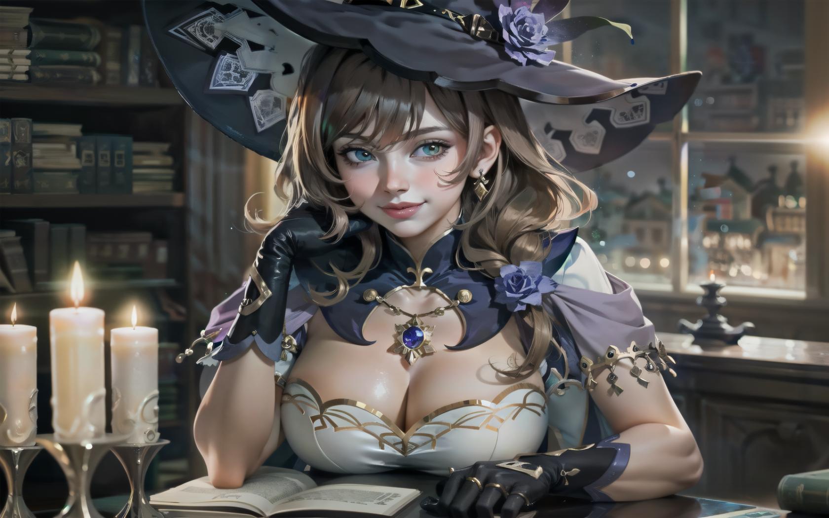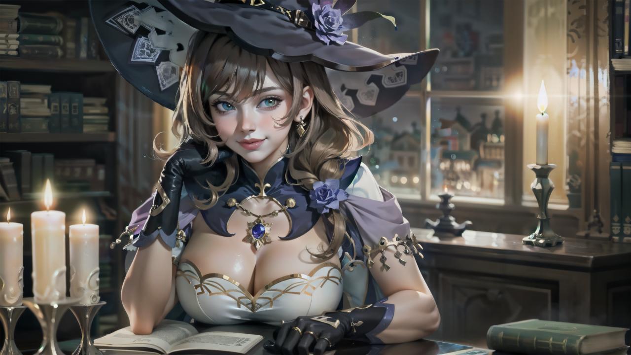 1girl, bangs, black gloves, blue eyes, book, bookshelf, brown hair, candle, candlelight , candlestand, capelet, cleavage, earrings, fire, flame, flower, gloves, green eyes, hair flower, hair ornament, hair over shoulder, hat, hat flower, indoors, jewelry, large breasts, long hair, looking at viewer, necklace, purple flower, purple headwear, purple rose, rose, smile, solo, witch, witch hat