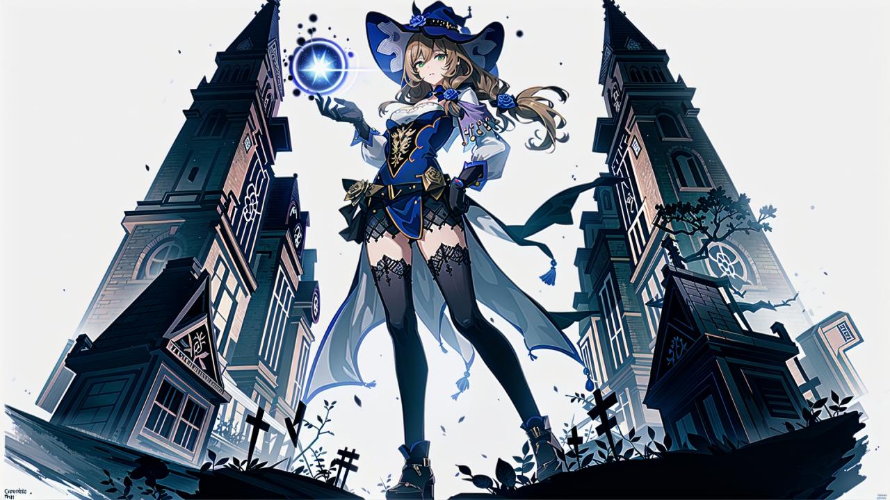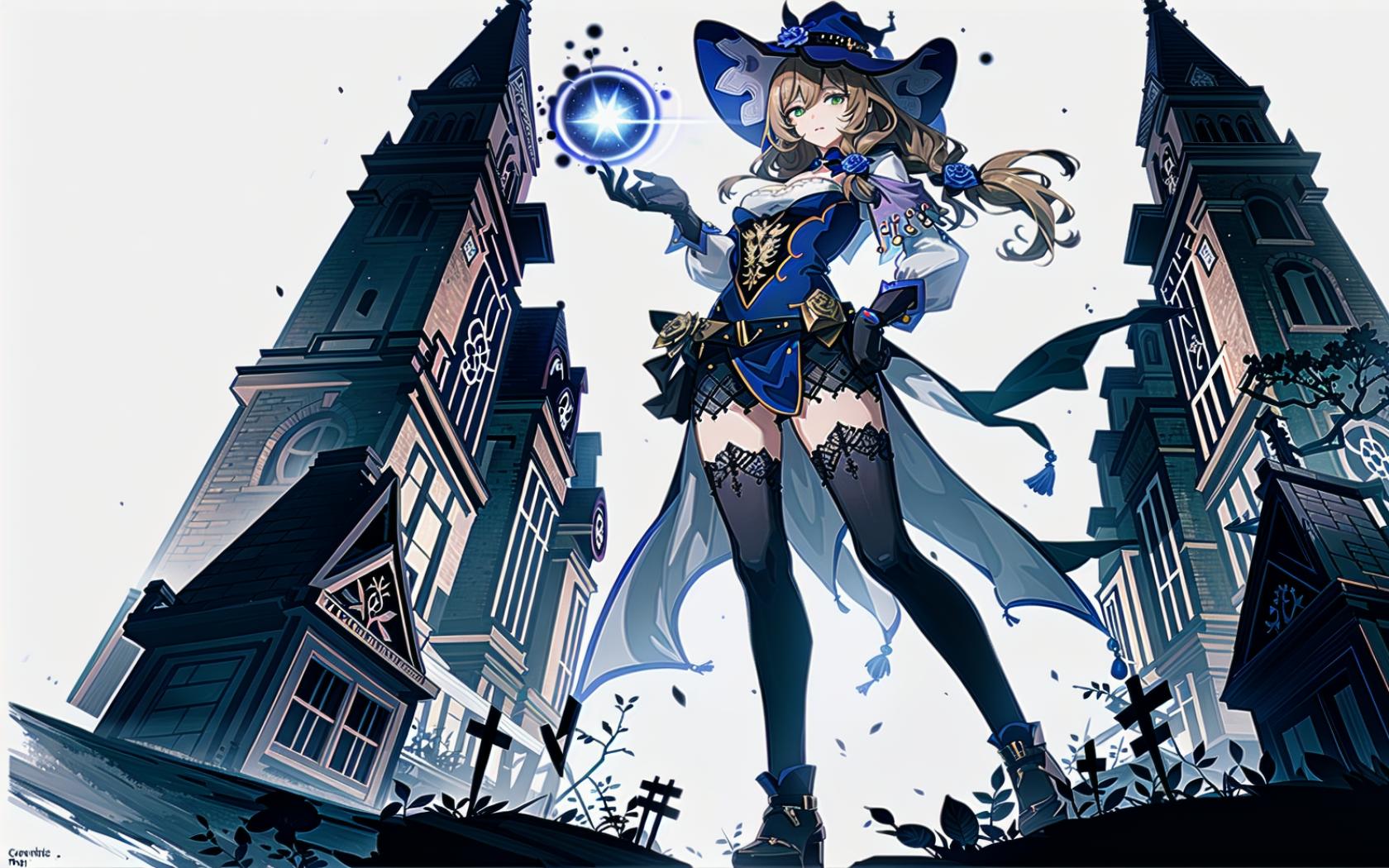 1girl, artist name, bangs, black gloves, black thighhighs, blue flower, blue rose, brown hair, building, capelet, dress, flower, full body, gloves, green eyes, hand on hip, hat, large breasts, long hair, looking at viewer, purple flower, purple headwear, purple rose , rose, smile, solo, standing, thighhighs, vision (genshin impact), witch, witch hat