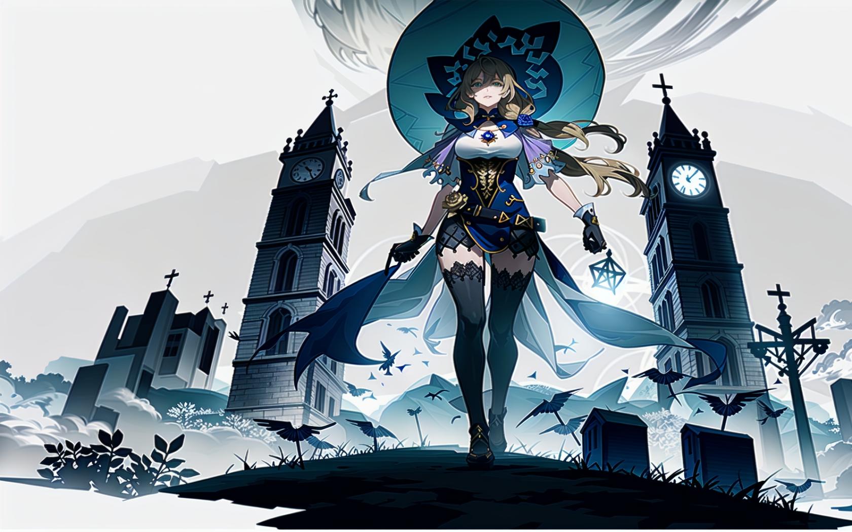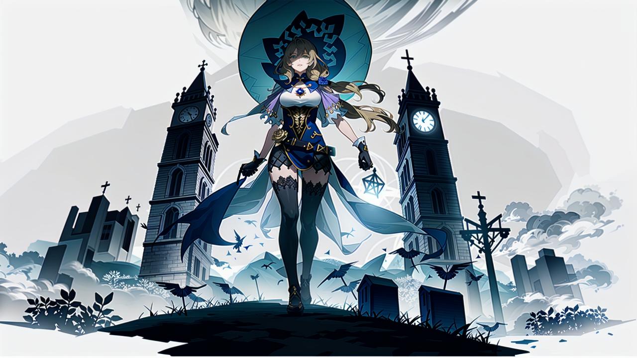 1girl, bangs, black gloves, black thighhighs, blue eyes, blue flower, blue rose, brown hair, capelet, clock, cross, dress, flower, full body, gloves, green eyes, hat, large breasts, long hair, looking at viewer, outdoors, purple headwear, rose, smile, solo, standing, thighhighs, tower , vision (genshin impact), witch, witch hat