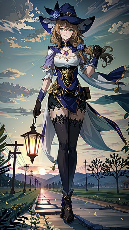 1girl, bangs, black footwear, black gloves, black thighhighs, book, brown hair, capelet, cleavage, cloud, cloudy sky, dress, flower, full body, gloves, green eyes, hair flower, hair ornament, hat, hat flower, holding, jewelry, lamppost , lantern, large breasts, long hair, looking at viewer, outdoors, purple flower, purple headwear, rose, sky, smile, solo, standing, thighhighs, tree, vision (genshin impact), walking, witch hat