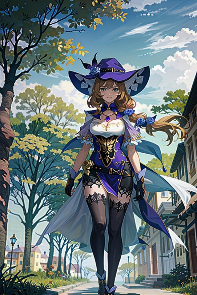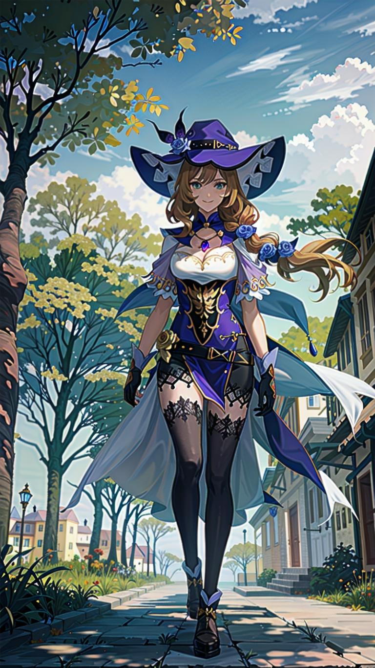 1girl, bangs, black footwear, black gloves, black thighhighs, blue sky, brown hair, building, capelet, cleavage, cloud, day, dress, flower, full body, gloves, green eyes, hair ornament, hat, large breasts, long hair, looking at viewer, outdoors, purple flower, purple headwear, purple rose , rose, sky, smile, solo, standing, thighhighs, tree, vision (genshin impact), walking, witch hat