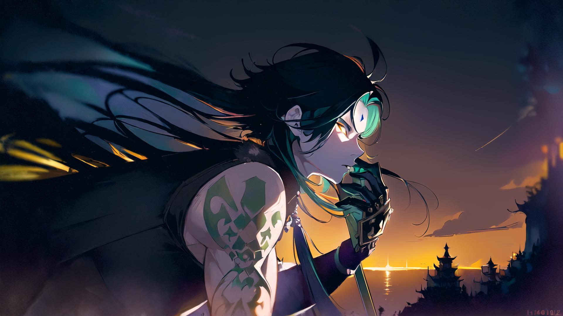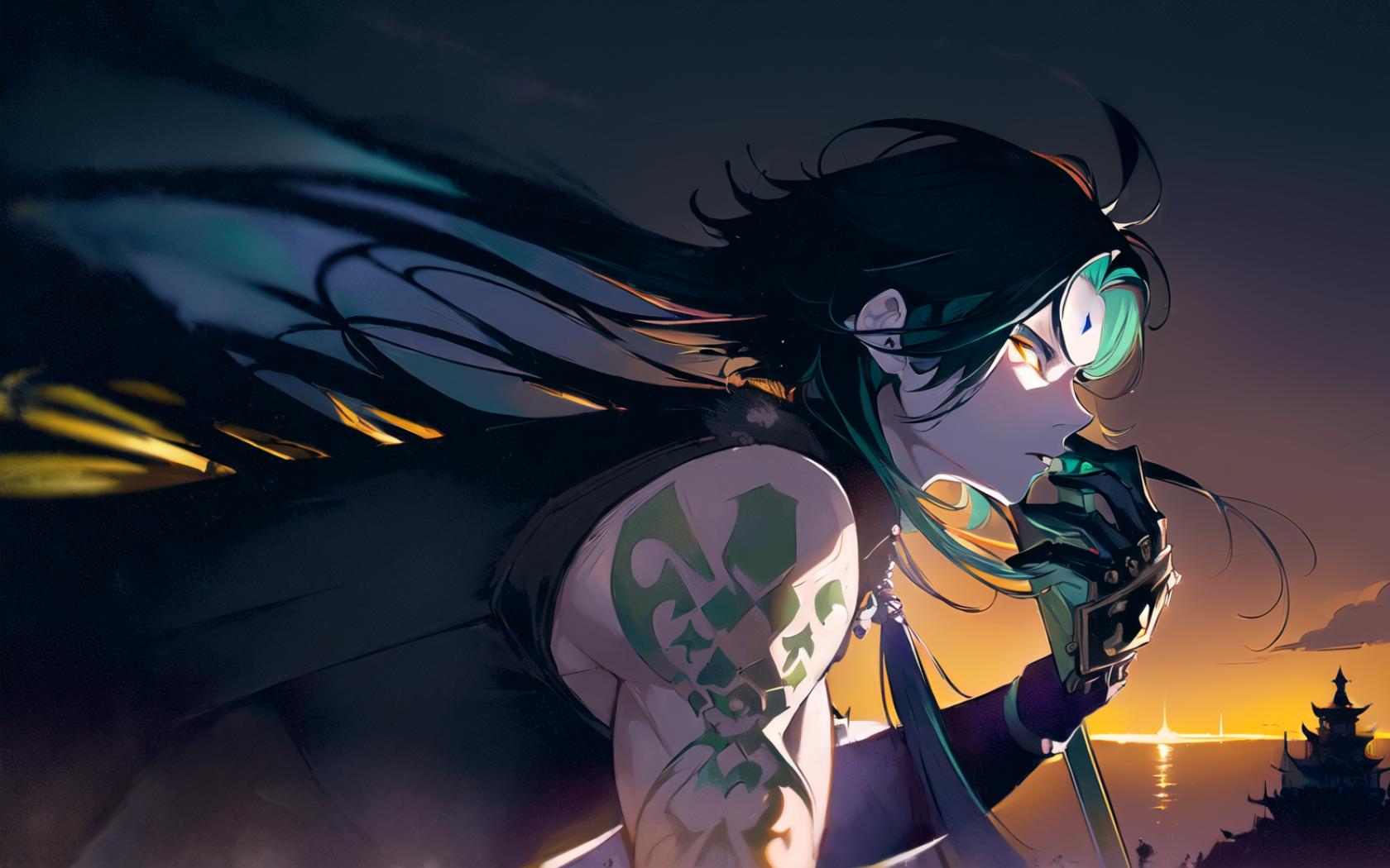 | Prompt | (dark fantasy art:1.7), (apocalytic art:1.4), (epic:1.2, perfect artwork), best quality,dynamic pose,sharp focus,(8k), (4k),(Masterpiece), (Best Quality), fantasy, extremely detailed, intricate, (highly detailed:1.4), hyper detailed, (perfect face), illustration,soft lighting,(specular lighting:1.4), Ultra detailed fantasy environment, clearly worked out detail, intricate, cinematic,(depth of field), (heroic:1.2), (dramatic light:1.1), <lora:Genshin_Xiao_AP_v9:1>,1boy, male focus, yellow eyes,official, ((((muscular)))), (mask:1.2), (twilight, sunset),wind,autumn, fall, aurora borealis, outdoors, medieval chinese harbor, medieval chinese town, (cliffs), (top of a cliff:1.2) polearm, (holding polearm:1.2), (fighting chinese demon:1.4), angry, |