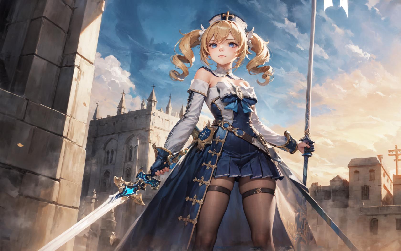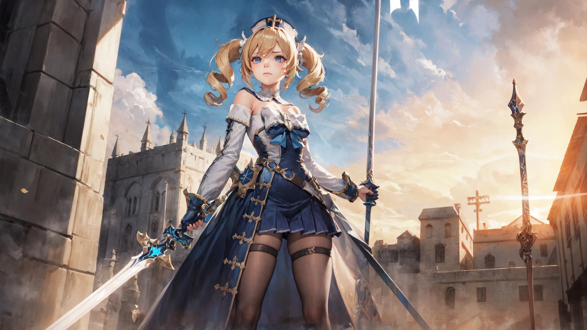1girl, bangs, bare shoulders, belt, blonde hair, blue eyes, bow, building, church , cloud, cloudy sky, cross, detached collar, detached sleeves, dress, drill hair, dual wielding, hat, holding, holding sword, holding weapon, long hair, long sleeves, looking at viewer, outdoors, pantyhose, skirt, sky, solo, standing, sword, thigh strap, twin drills, twintails, weapon, white headwear, white sleeves