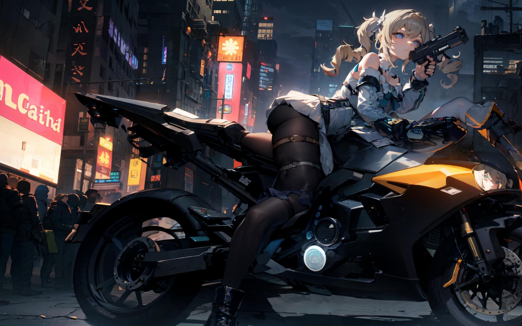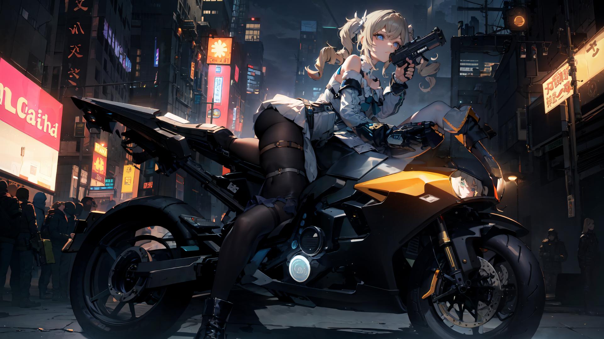 1girl, ass, bangs, bare shoulders, black footwear, blonde hair, blue eyes, boots, building, city, detached sleeves, dress, drill hair, finger on trigger, ground vehicle, gun, hair ornament, handgun, high heels, holding, holding gun, holding weapon, lamppost, long hair, long sleeves, looking at viewer, motor vehicle, motorcycle, multiple boys, multiple others, night, night sky, outdoors, pantyhose, road, sign, solo focus, street, thigh strap, traffic light , twin drills, twintails, weapon, white dress