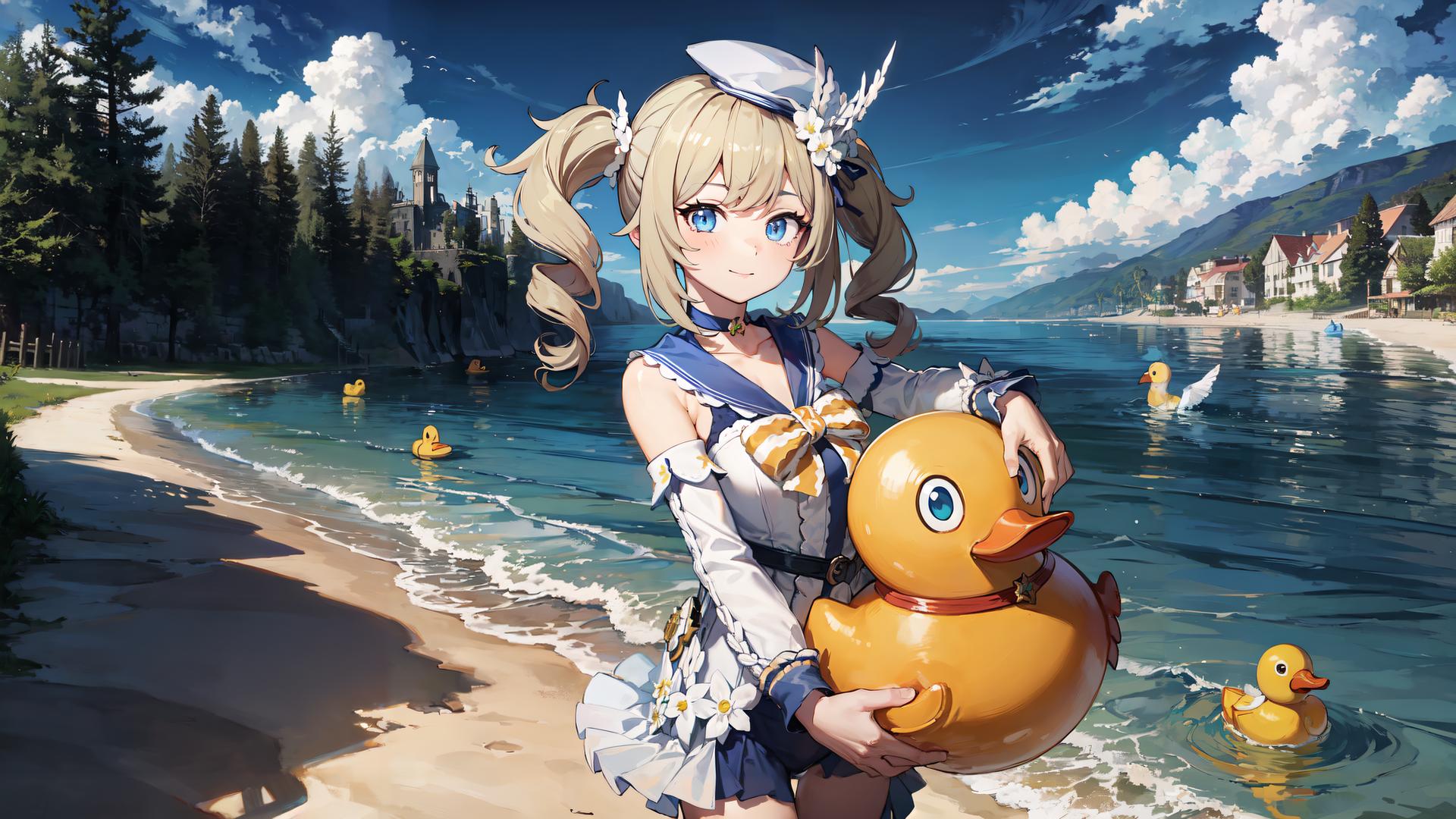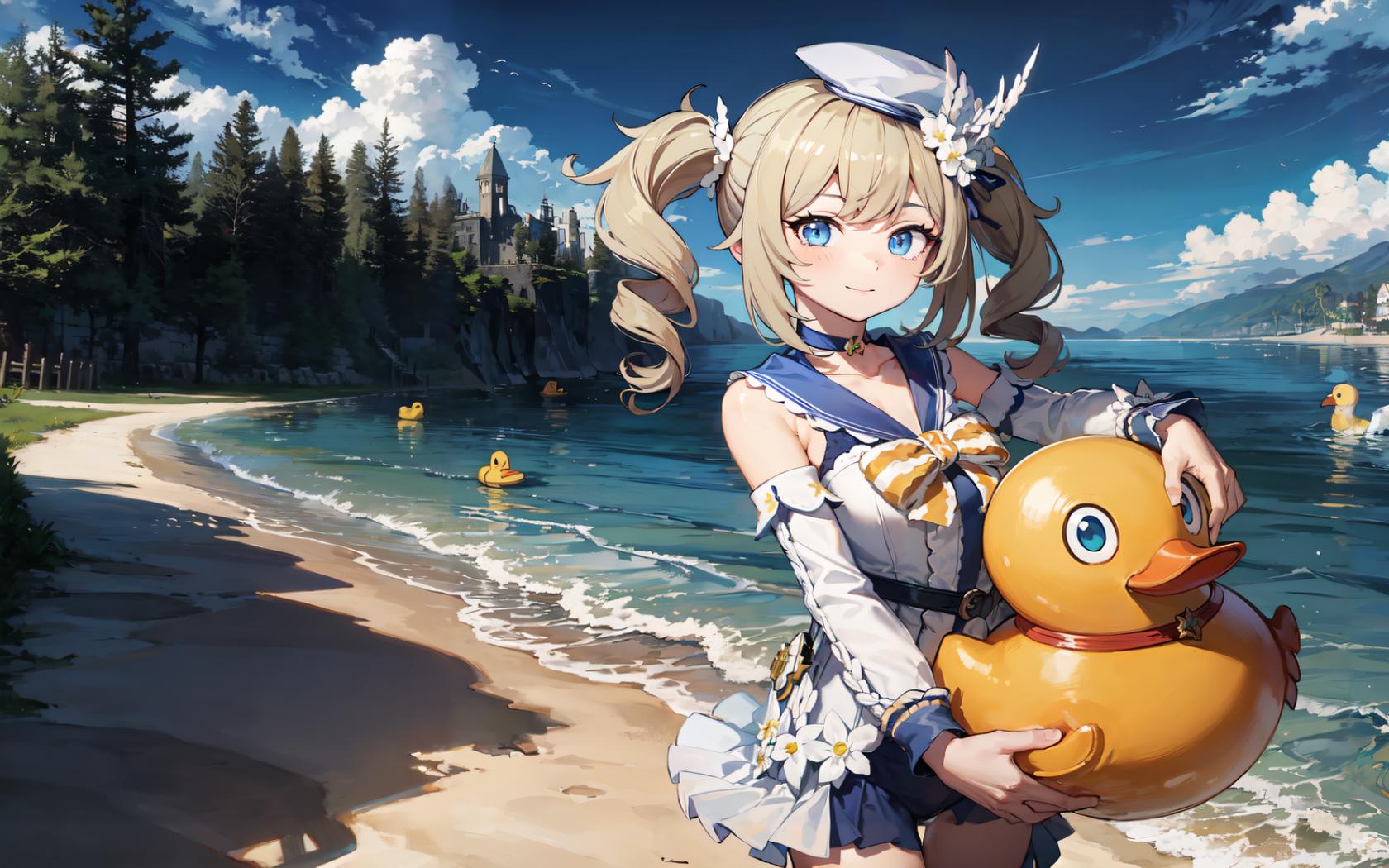 1girl, bangs, bare shoulders, beach, bird, blonde hair, blue eyes, blue sailor collar, blue sky, blush, bow, bowtie, building, choker, closed mouth, cloud, cowboy shot, day, detached sleeves, dress, drill hair, duck , flower, hair flower, hair ornament, hat, holding, long hair, long sleeves, looking at viewer, official alternate costume, one-piece swimsuit, outdoors, rubber duck, sailor collar, sailor hat, skirt, sky, smile, solo, swimsuit, twin drills, twintails, water, white dress, white flower, white headwear