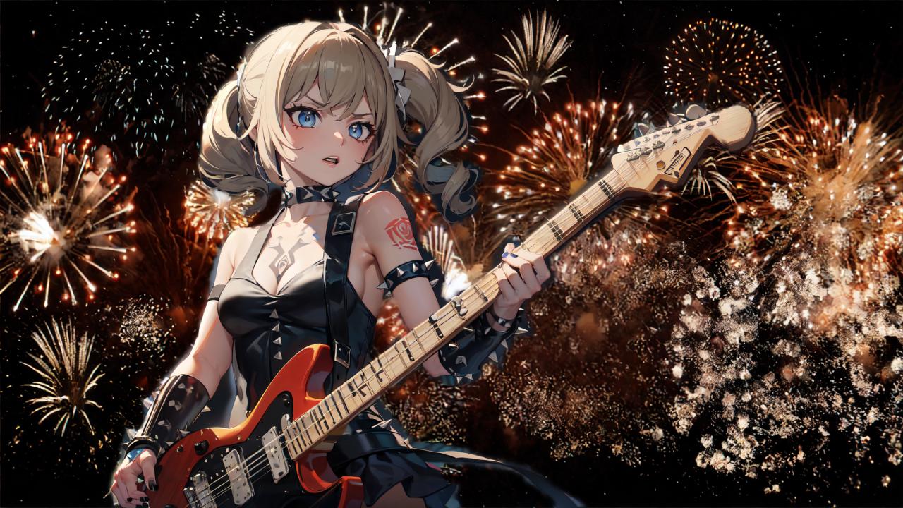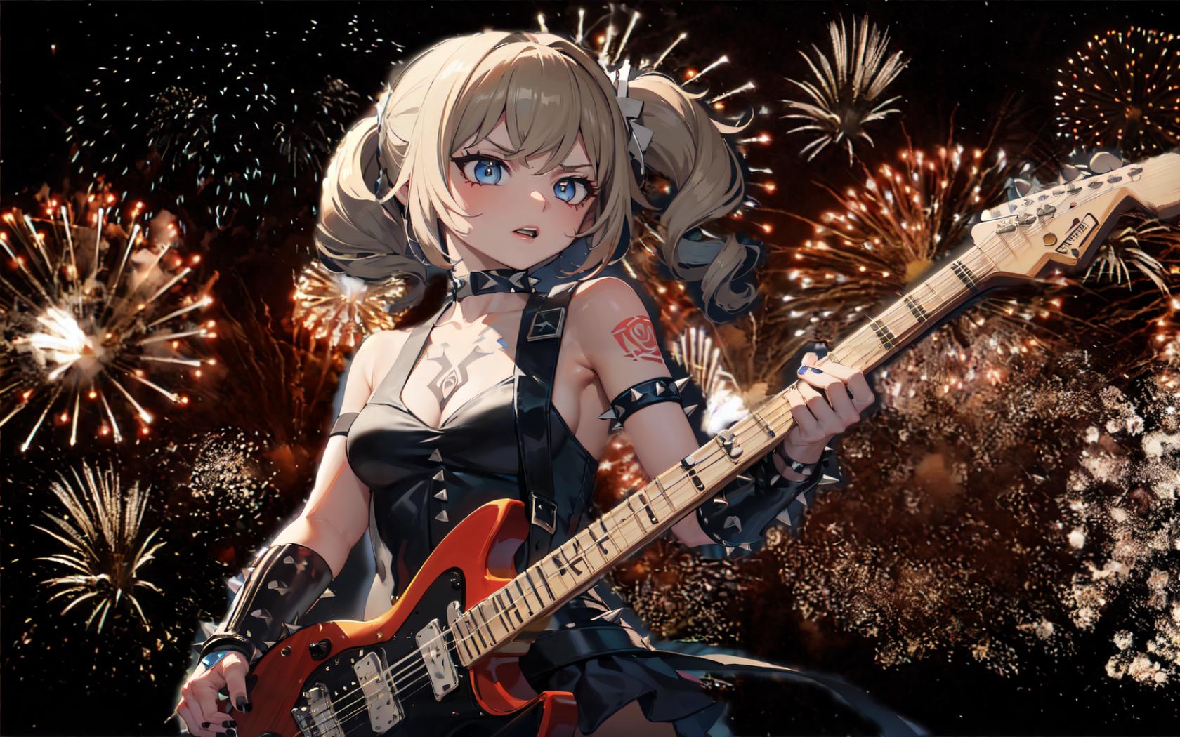 1girl, aerial fireworks, alternate costume, arm strap, armlet, bangs, bare shoulders, black choker, black dress, black nails, blonde hair, blue eyes, blush, choker, cleavage, collar, collarbone, dress, drill hair, electric guitar, fireworks, gibson les paul , guitar, holding, holding instrument, instrument, jewelry, looking at viewer, medium breasts, nail polish, night, parted lips, playing instrument, plectrum, skirt, sleeveless, sleeveless dress, solo, spiked bracelet, spiked collar, spikes, tattoo, twin drills, twintails, upper body, v-shaped eyebrows