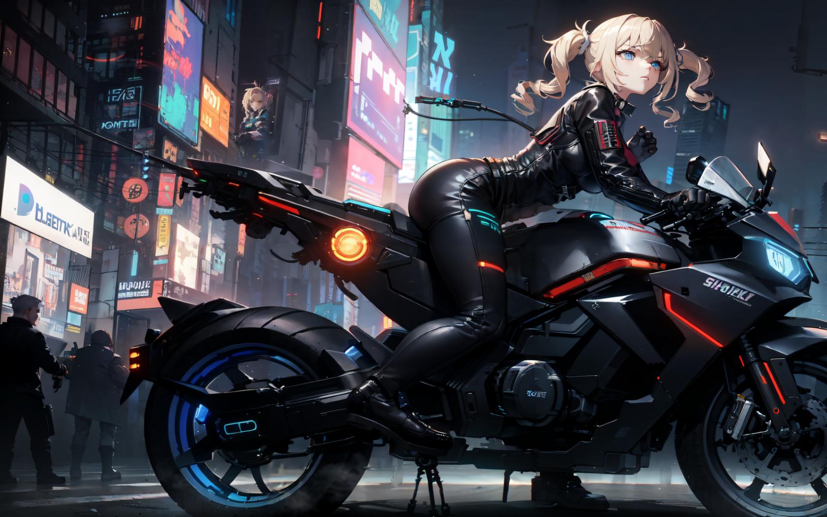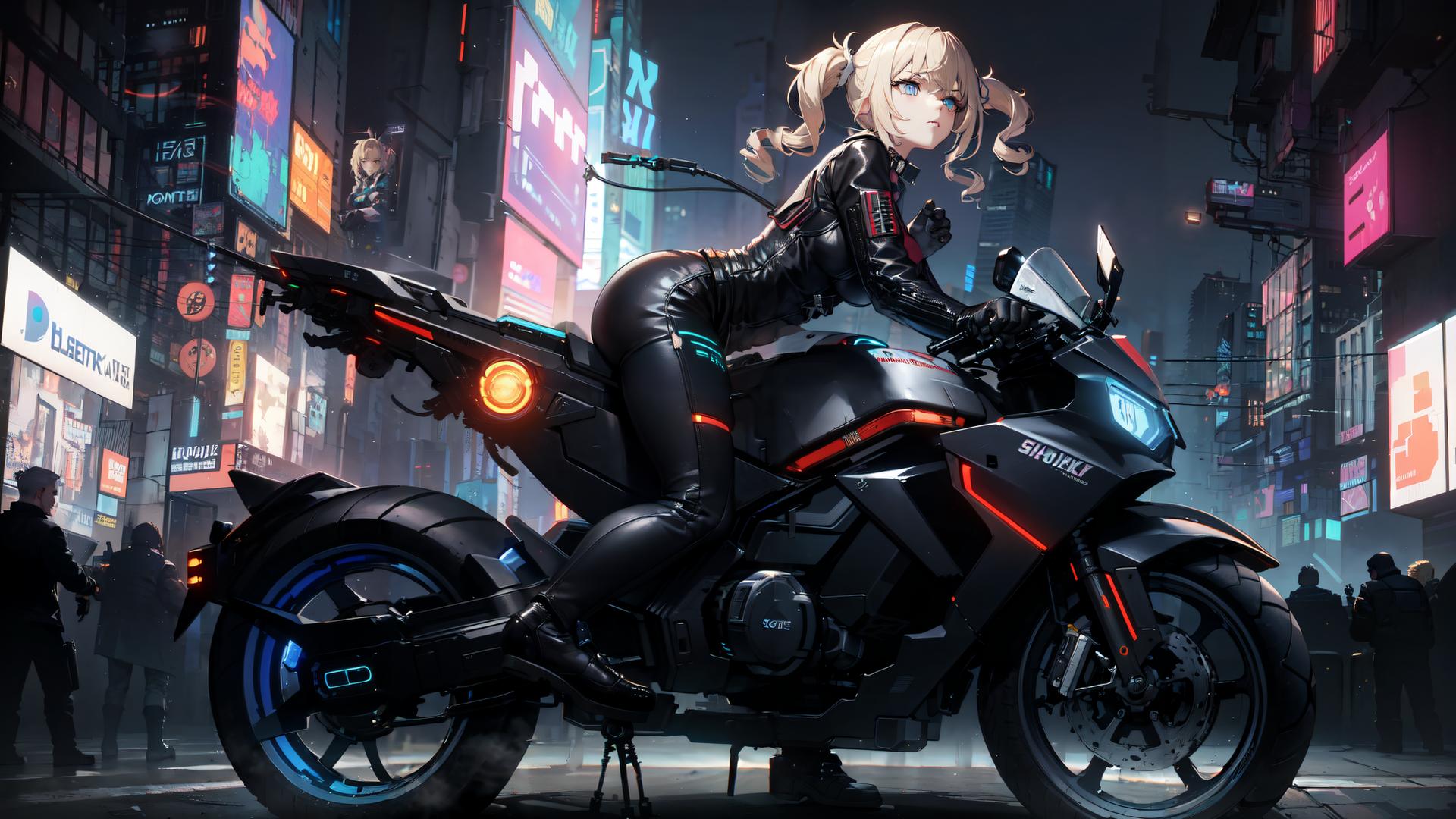 1girl, ass, bangs, biker clothes , black bodysuit, black gloves, blonde hair, blue eyes, bodysuit, boots, building, city, drill hair, full body, gloves, ground vehicle, high heels, holding, long hair, looking at viewer, motor vehicle, motorcycle, multiple boys, multiple others, night, night sky, outdoors, road, shiny clothes, sign, skin tight, sky, solo focus, street, twin drills, twintails