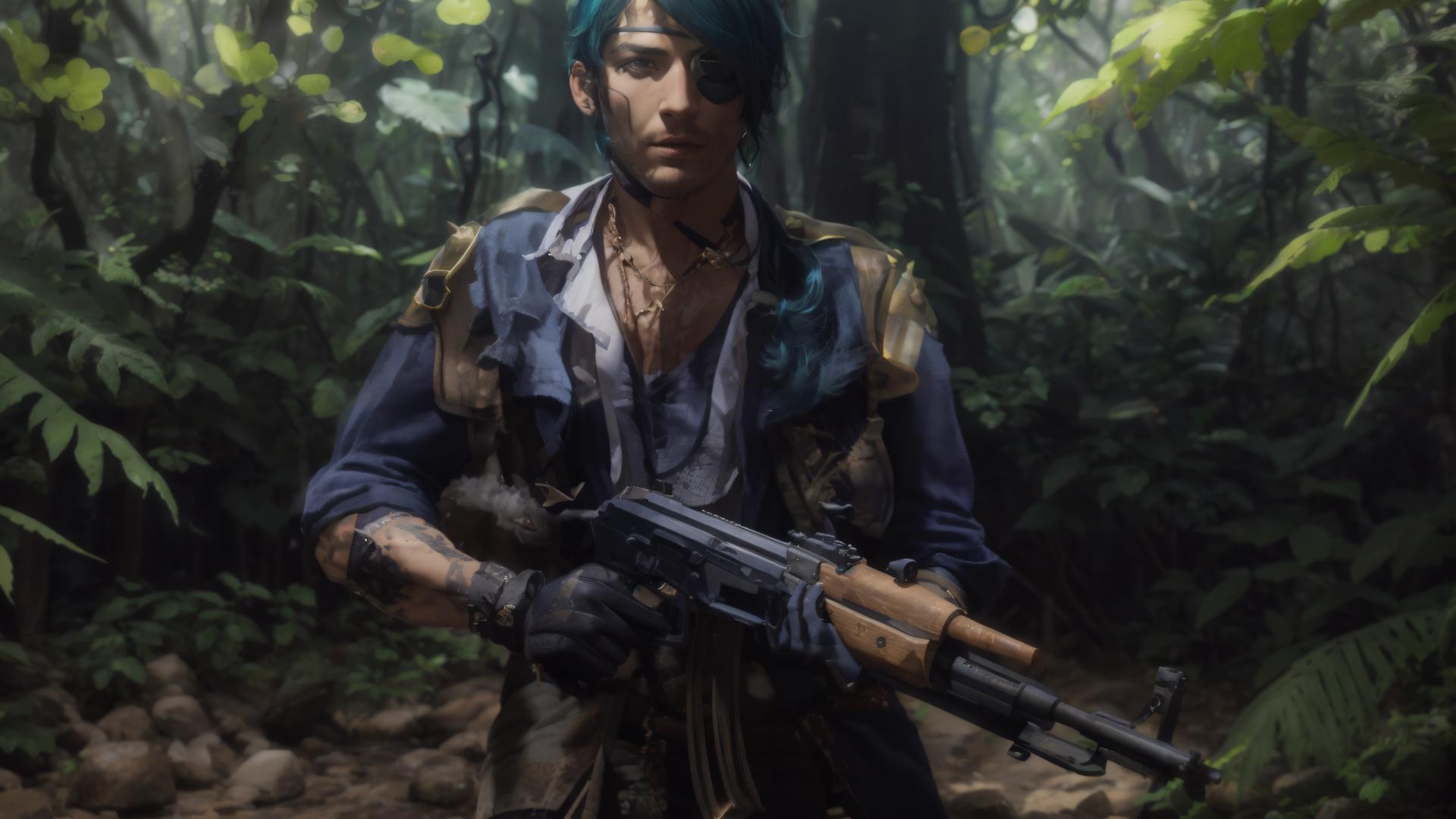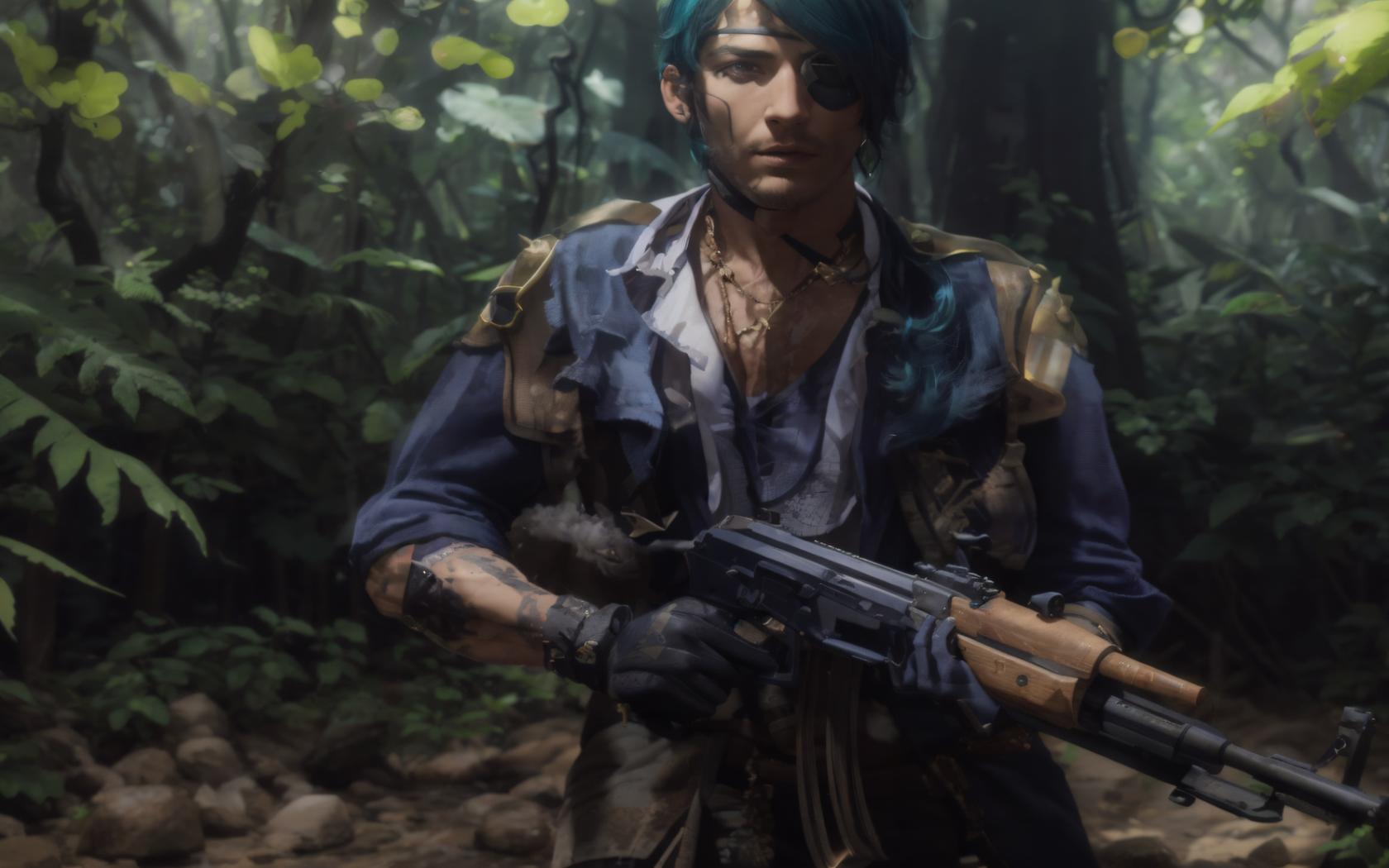 1boy, assault rifle, black gloves, black hair, blue jacket, dark skin, dark-skinned male, dog tags , eyepatch, facial hair, forest, gloves, gun, holding, holding gun, holding weapon, jacket, jewelry, looking at viewer, male focus, nature, outdoors, rifle, shirt, solo, tattoo, weapon