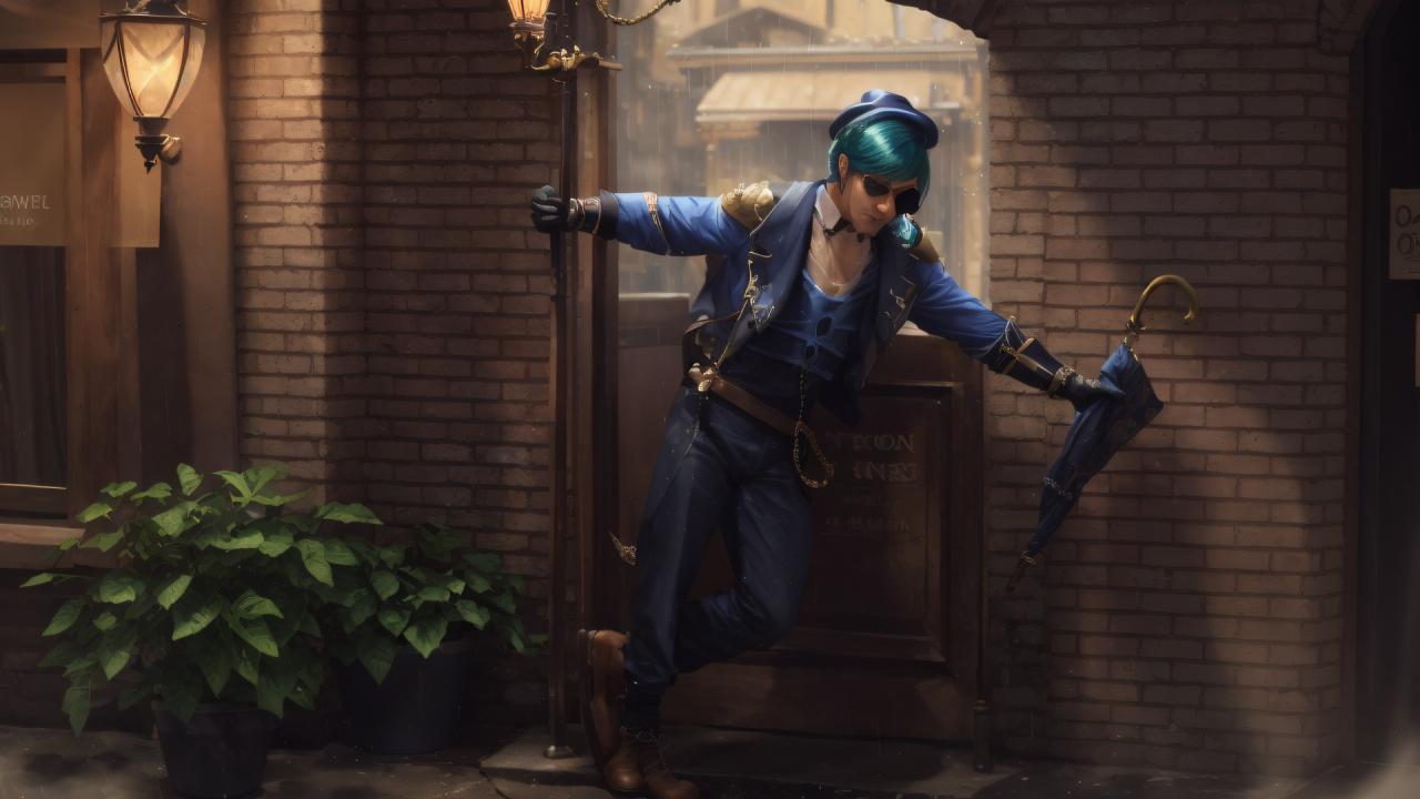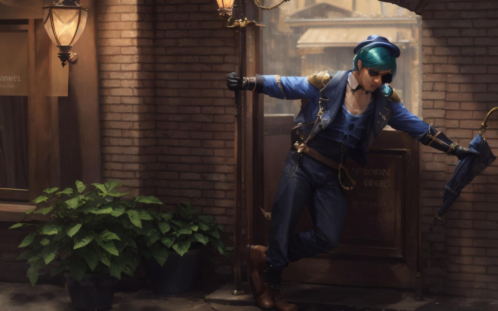 1boy, alternate costume, artist name, bangs, belt, black gloves, black pants, blue hair, blue headwear, blue jacket, blue pants, boots, brick wall, brown footwear, chain, closed umbrella, collared shirt, dark skin, dark-skinned male, door, earrings, eyepatch, full body, fur trim, gloves, gold chain , hat, holding, jacket, jewelry, long sleeves, male focus, multicolored hair, open clothes, open jacket, outdoors, pants, plant, shirt, solo, standing, standing on one leg, streaked hair, umbrella, vest