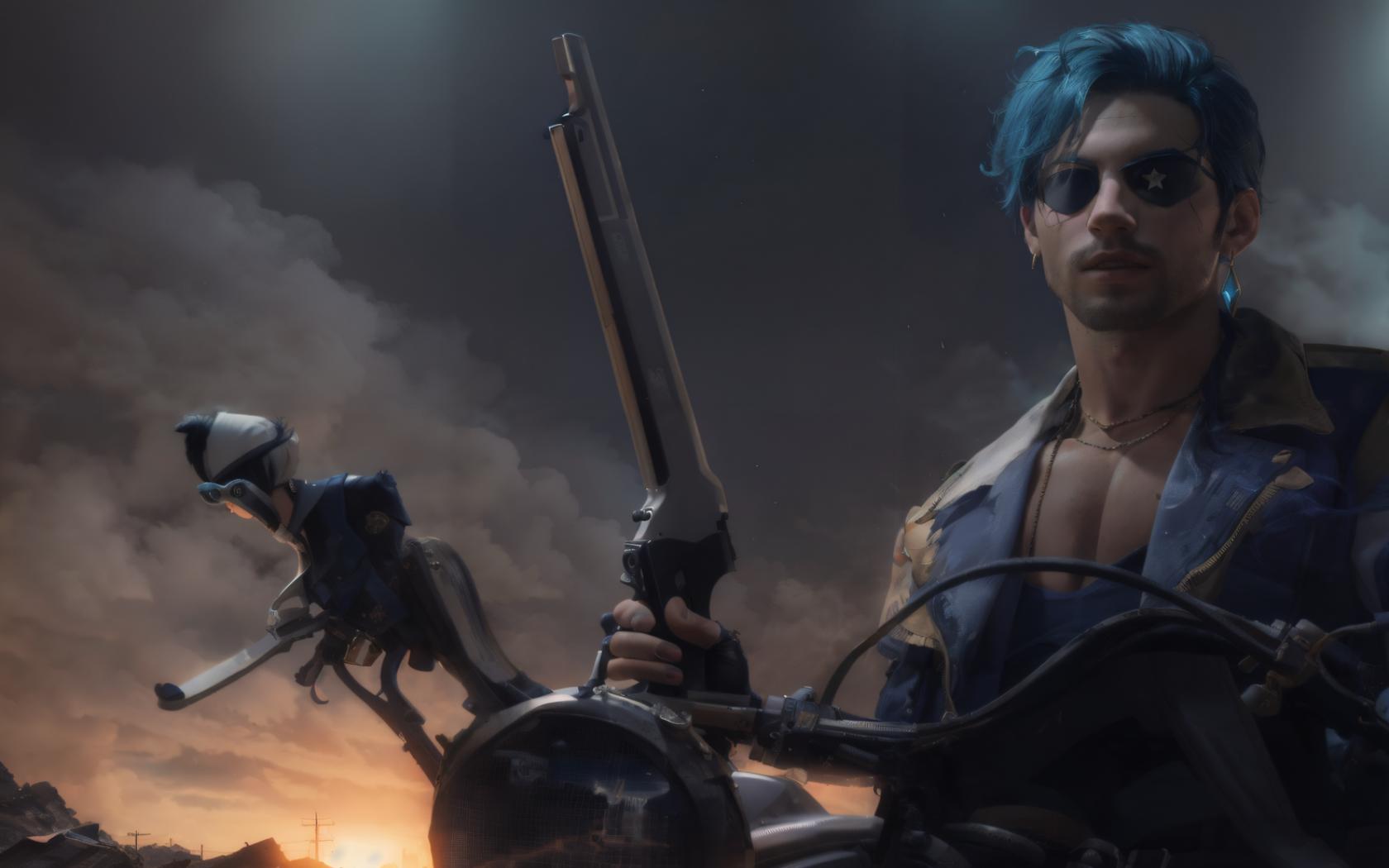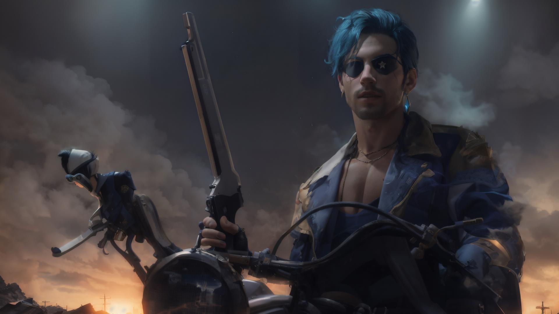 1boy, black gloves, blue hair, blue jacket, cloud, earrings, eyepatch, fingerless gloves, gloves, ground vehicle, gun, helmet, holding, holding gun, holding weapon, jacket, jewelry, male focus, motor vehicle, motorcycle, motorcycle helmet , necklace, open clothes, outdoors, shirt, short hair, sky, sunglasses, weapon