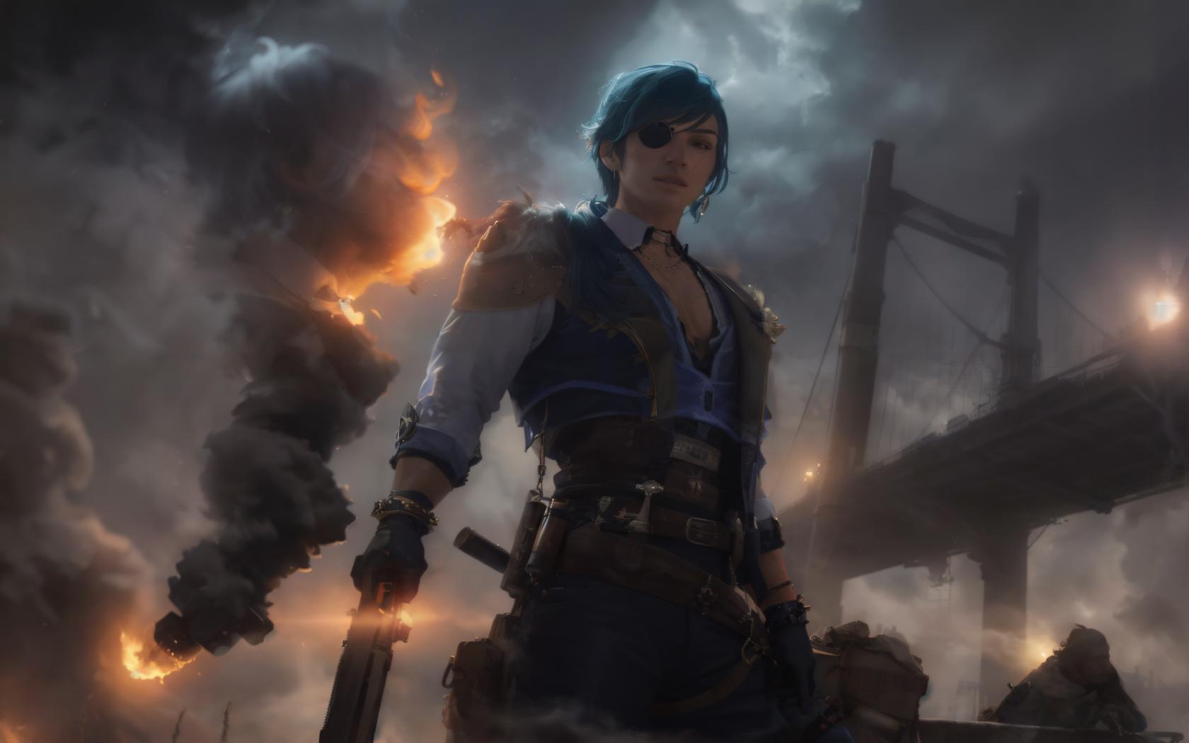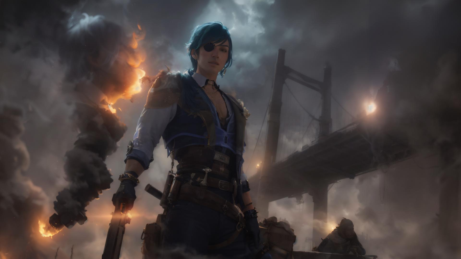 1boy, belt, black gloves, blue eyes, blue hair, cloud, cloudy sky, dark skin, dark-skinned male, earrings, eyepatch, fire, gloves, gun, handgun, holding, holding gun, holding weapon, jewelry, male focus, shirt, single earring , smoke, solo focus, vest, weapon