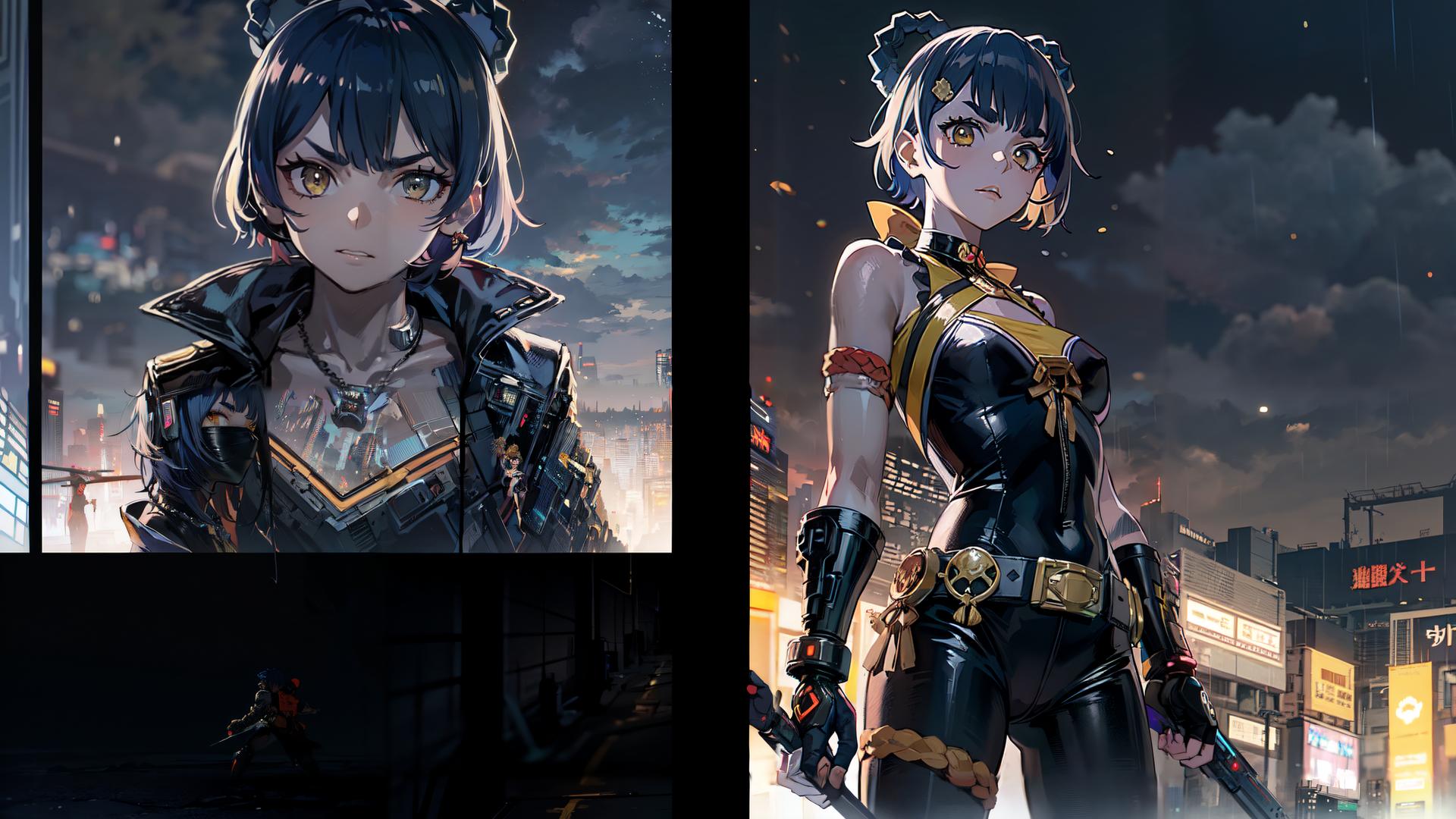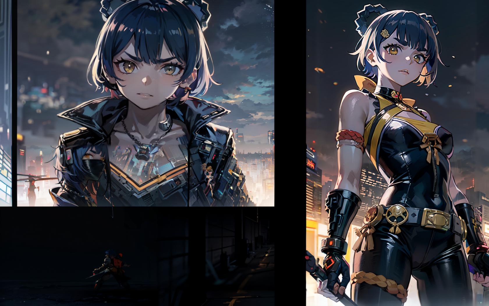 1girl, bare shoulders, belt, black gloves, black hair, blue hair, braid, building, closed mouth, earrings, fingerless gloves, gloves, hair ornament, hair rings, hairclip, holding, holding sword, holding weapon, jacket, jewelry, leather , looking at viewer, multiple views, necklace, night, night sky, outdoors, short hair, sky, sword, weapon, yellow eyes