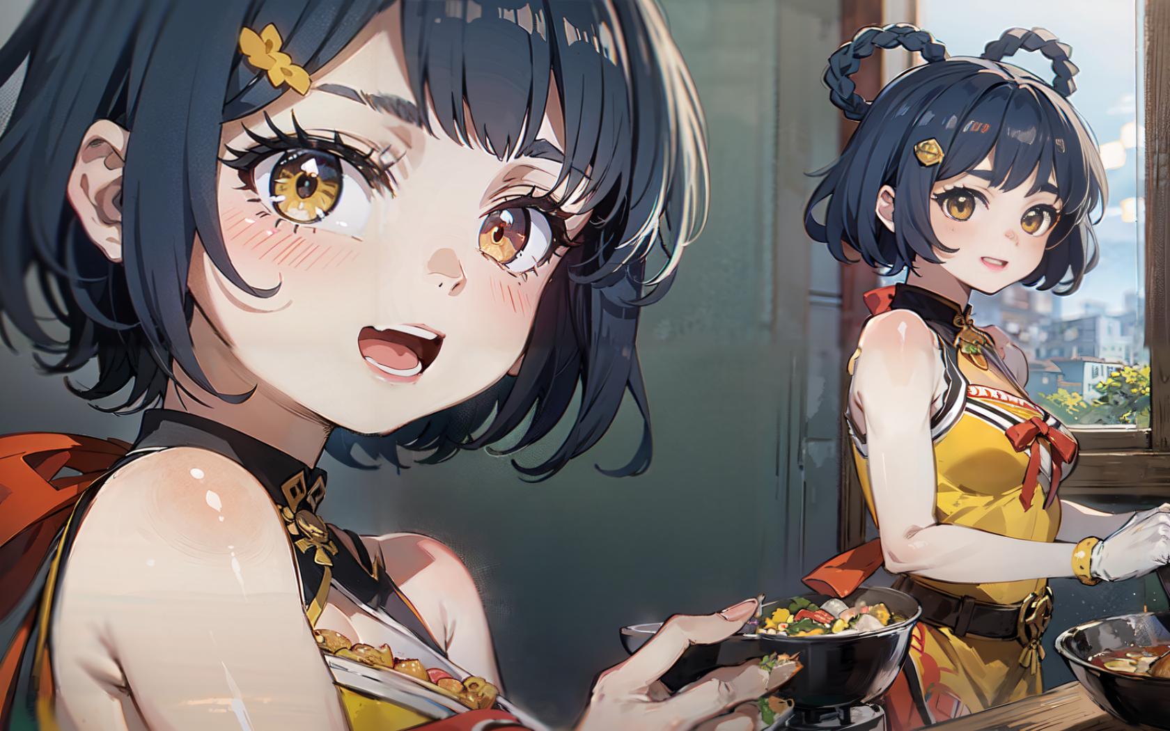 1girl, :d, bangs, bare shoulders, blue hair, blush, bowl, braid, chinese clothes, cloud, cooking , dress, food, gloves, hair ornament, hair rings, hairclip, holding, indoors, looking at viewer, multiple views, open mouth, short hair, sleeveless, sleeveless dress, small breasts, smile, white gloves, window, yellow dress, yellow eyes