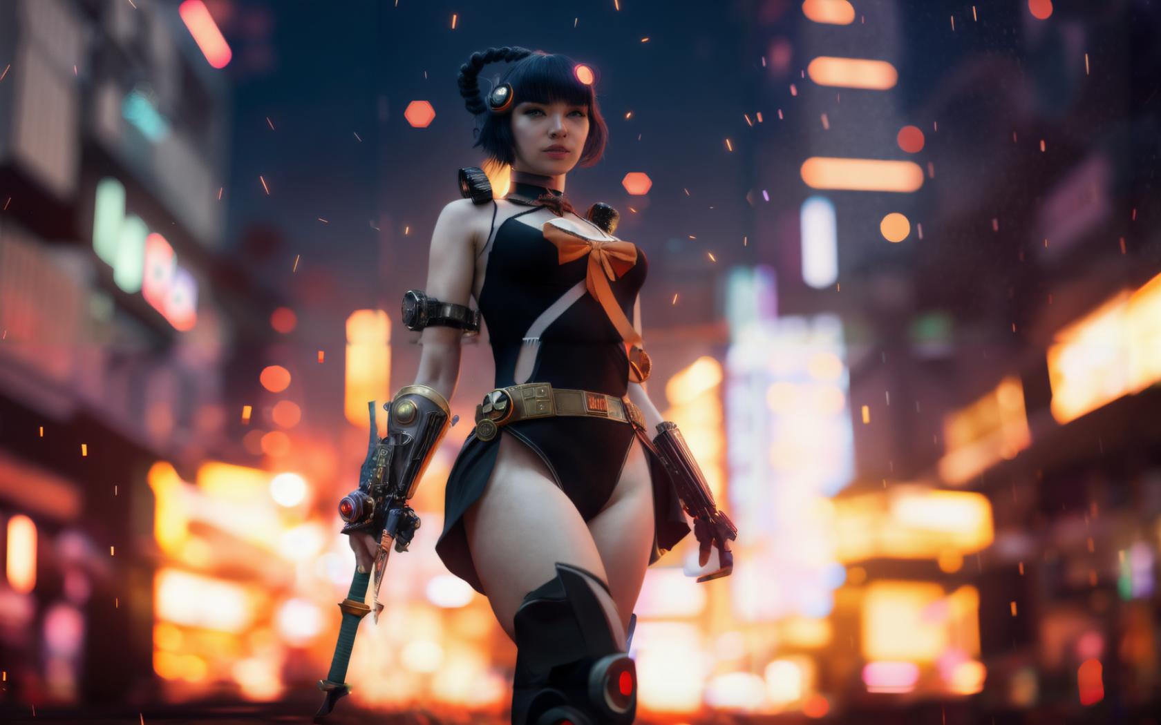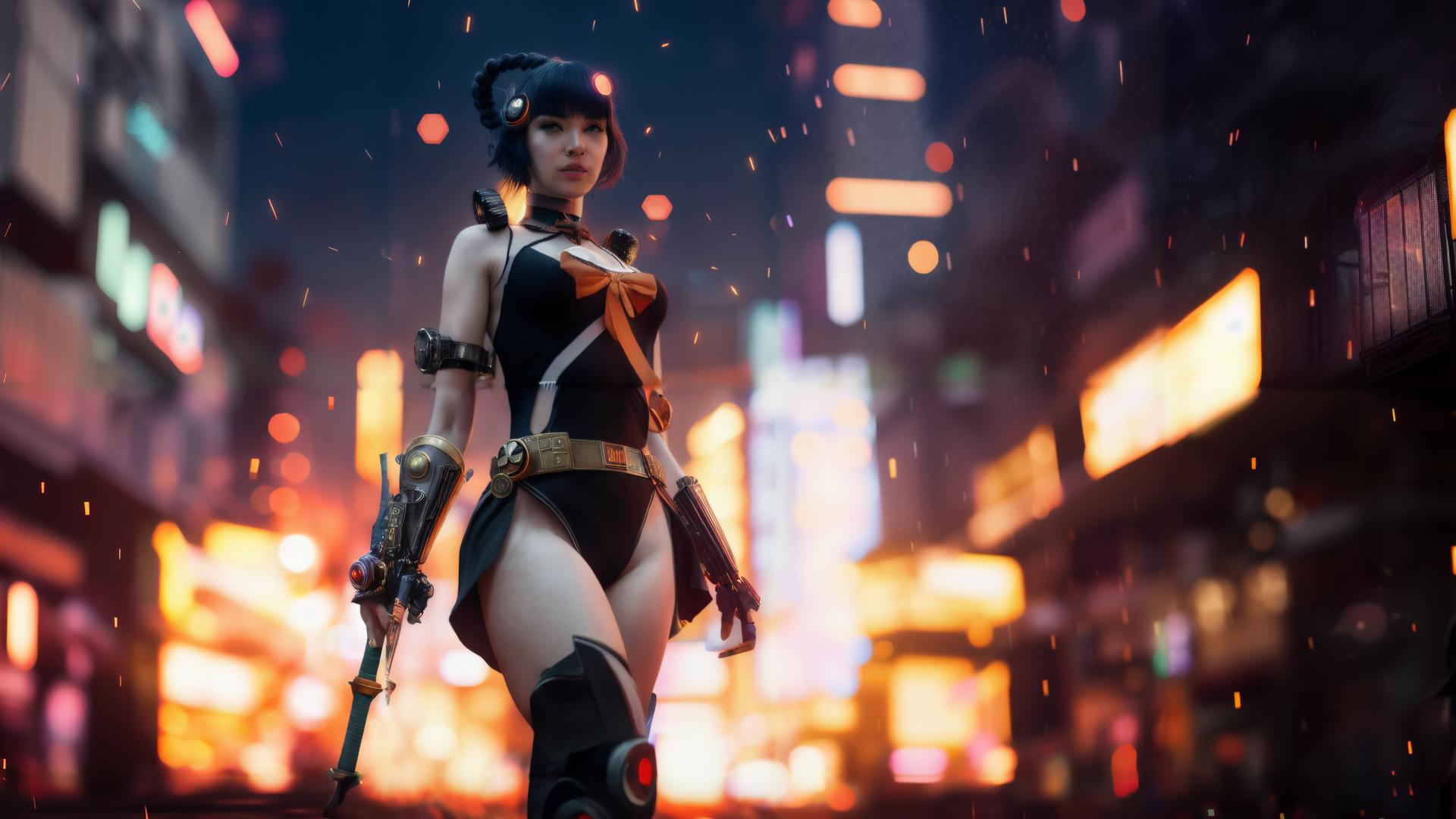 an image of a woman in a full body outfit playing a game at night, walking through the city street and some brightly lights are shining behind her