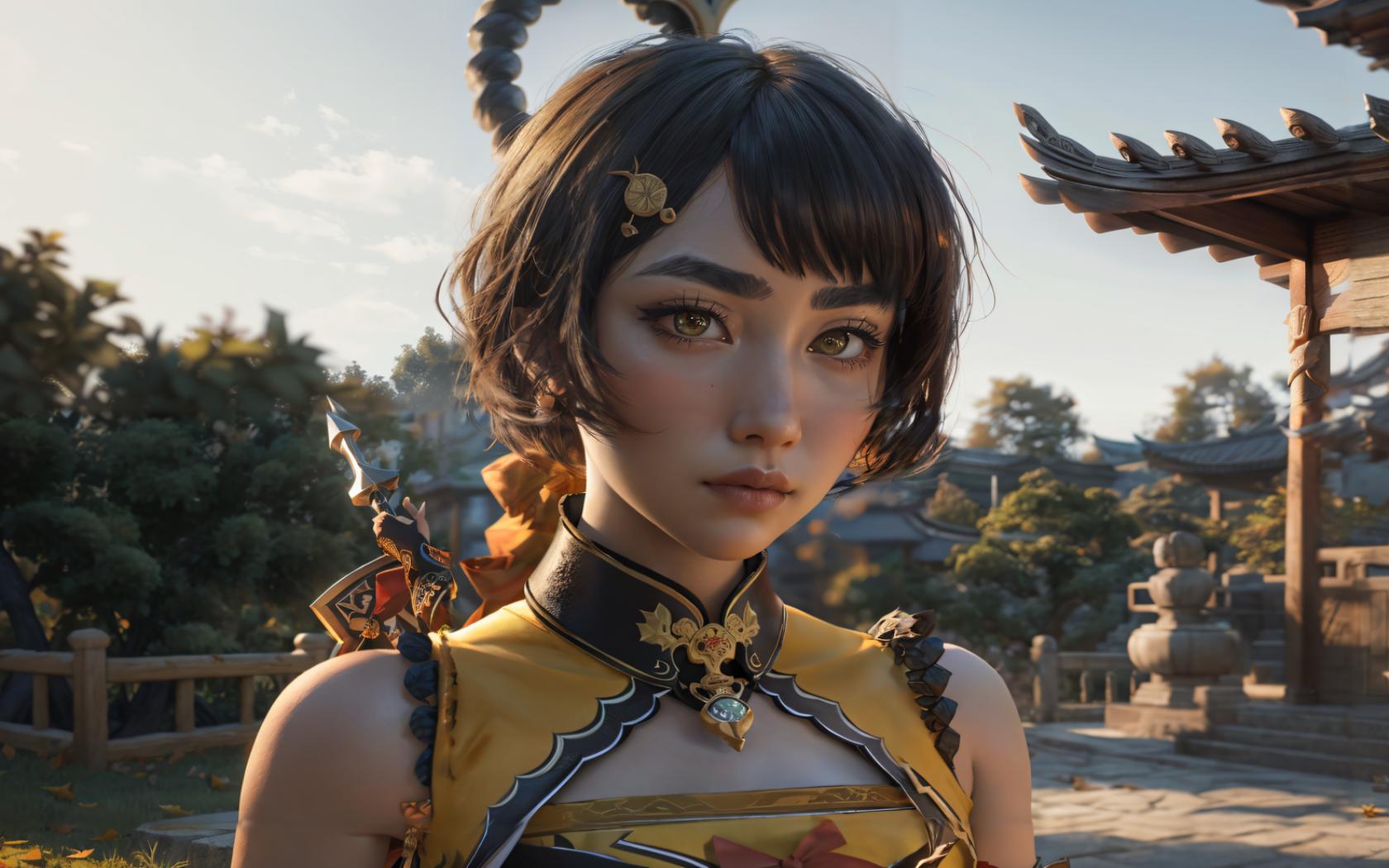 1girl, architecture, backlighting, bangs, bare shoulders, black hair, blue hair, braid, brown eyes, china dress, chinese clothes, day, dress, east asian architecture , hair ornament, hair rings, hairclip, looking at viewer, outdoors, polearm, portrait, realistic, scenery, short hair, sky, sleeveless, sleeveless dress, solo, thick eyebrows, tree, twin braids, upper body, weapon, yellow eyes