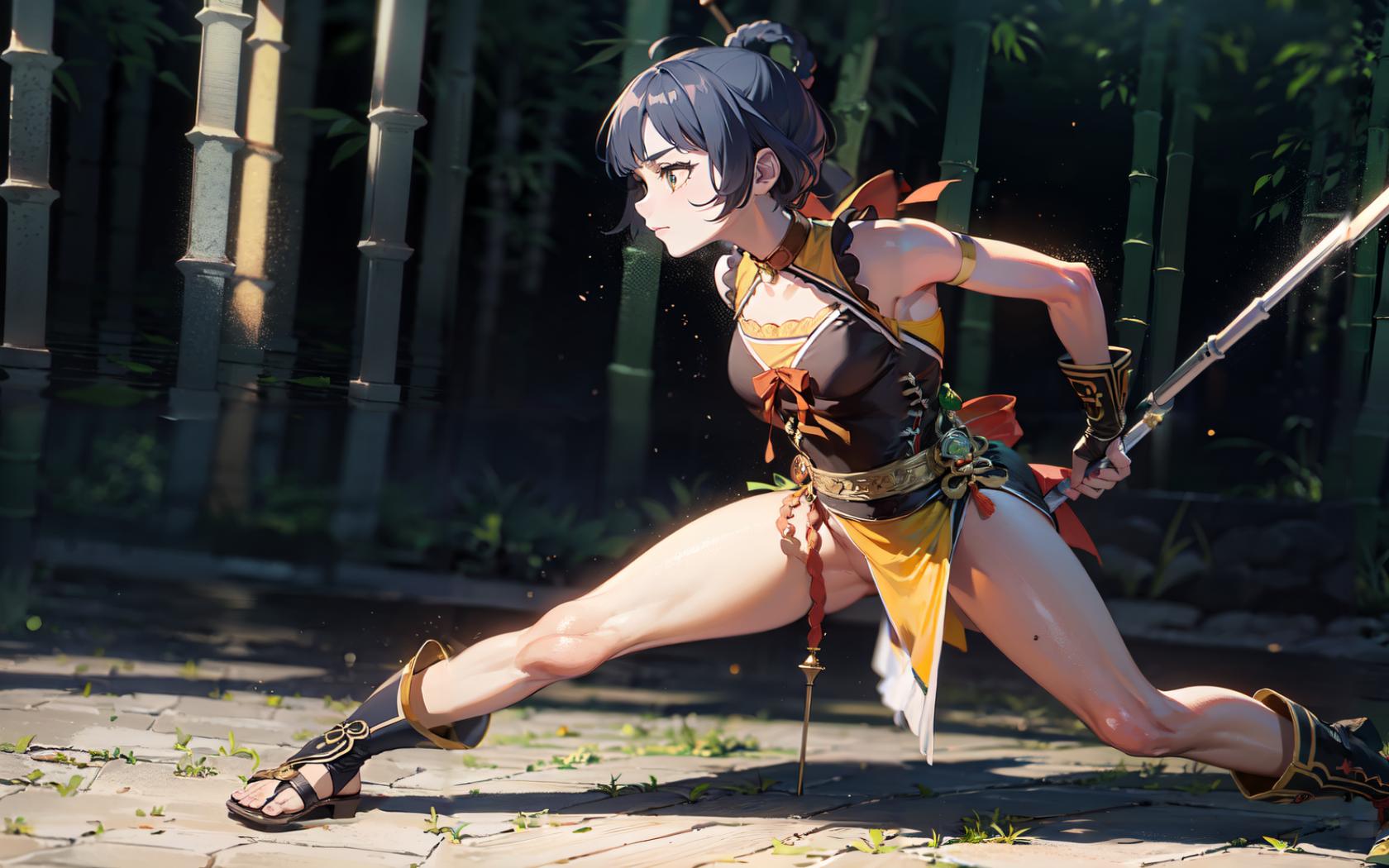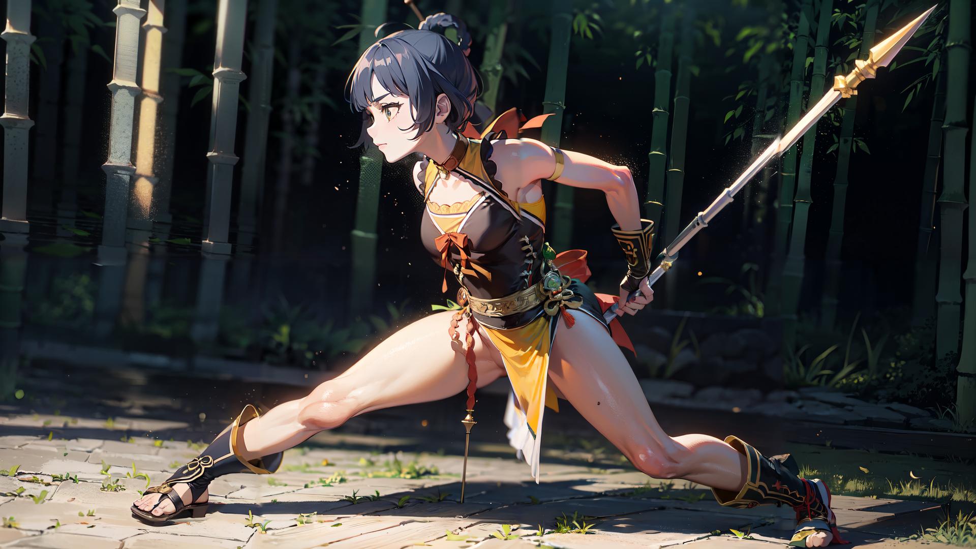 1girl, bamboo, bamboo forest , bangs, bare shoulders, black footwear, black gloves, black hair, blue hair, boots, braid, china dress, chinese clothes, dress, fighting stance, fingerless gloves, forest, full body, gloves, hair ornament, hair rings, holding, holding polearm, holding weapon, nature, outdoors, pelvic curtain, polearm, short hair, sleeveless, sleeveless dress, small breasts, solo, spear, weapon, yellow eyes