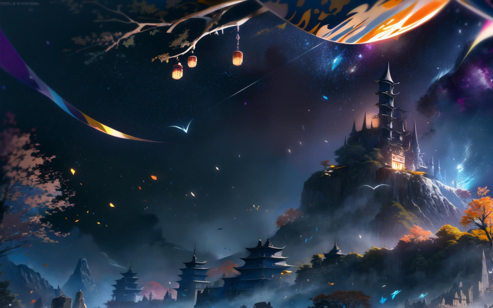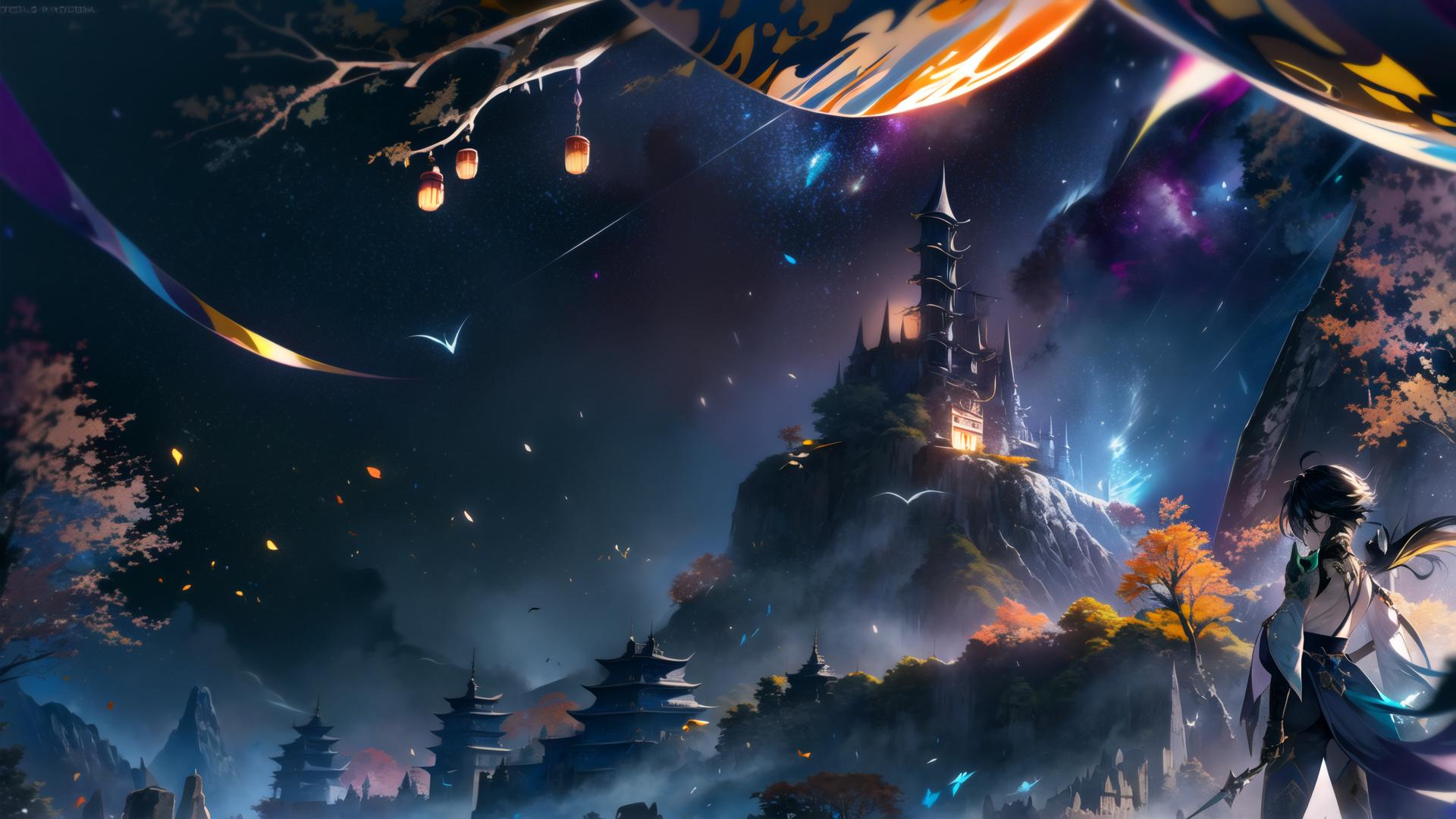 | Prompt | <lora:beautiful-eyes:0.6> (epic:1.5, perfect artwork), best quality,dynamic pose,sharp focus,(8k), (4k),(Masterpiece), (Best Quality), fantasy, extremely detailed, intricate, (highly detailed:1.4), hyper detailed, (perfect face), illustration,soft lighting,(specular lighting:1.4), Ultra detailed fantasy environment, clearly worked out detail, intricate, cinematic,(depth of field), (dark fantasy art:1.8), (realistic:1.2), <lora:Genshin_Xiao_AP_v9:1>,1boy, male focus, yellow eyes,official, (solo:1.4), (muscular), mask, (twilight, sunset),(orange fireworks),wind,autumn, fall, aurora borealis, ((standing top of a medieval chinese mansion)), (medieval chinese harbor below:1.3), (medieval boats), trees, leaves in the wind, holding polearm, serious, focused, view from behind, looking at viewer, cowboy shot, |