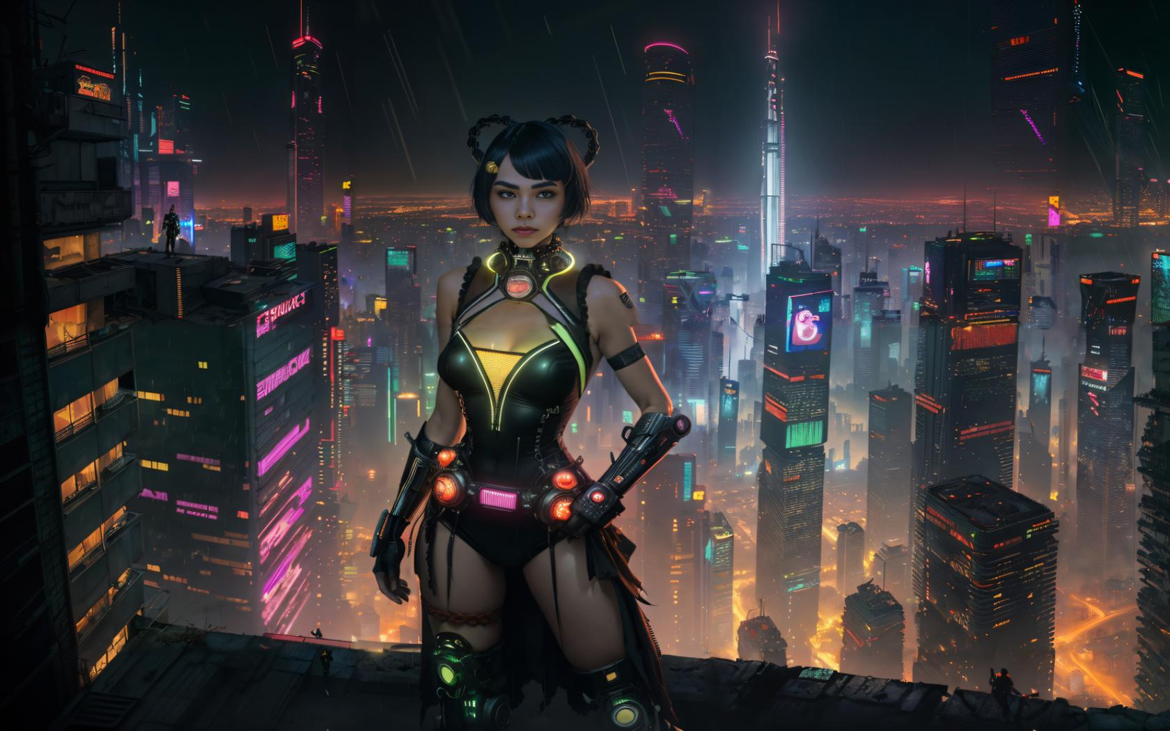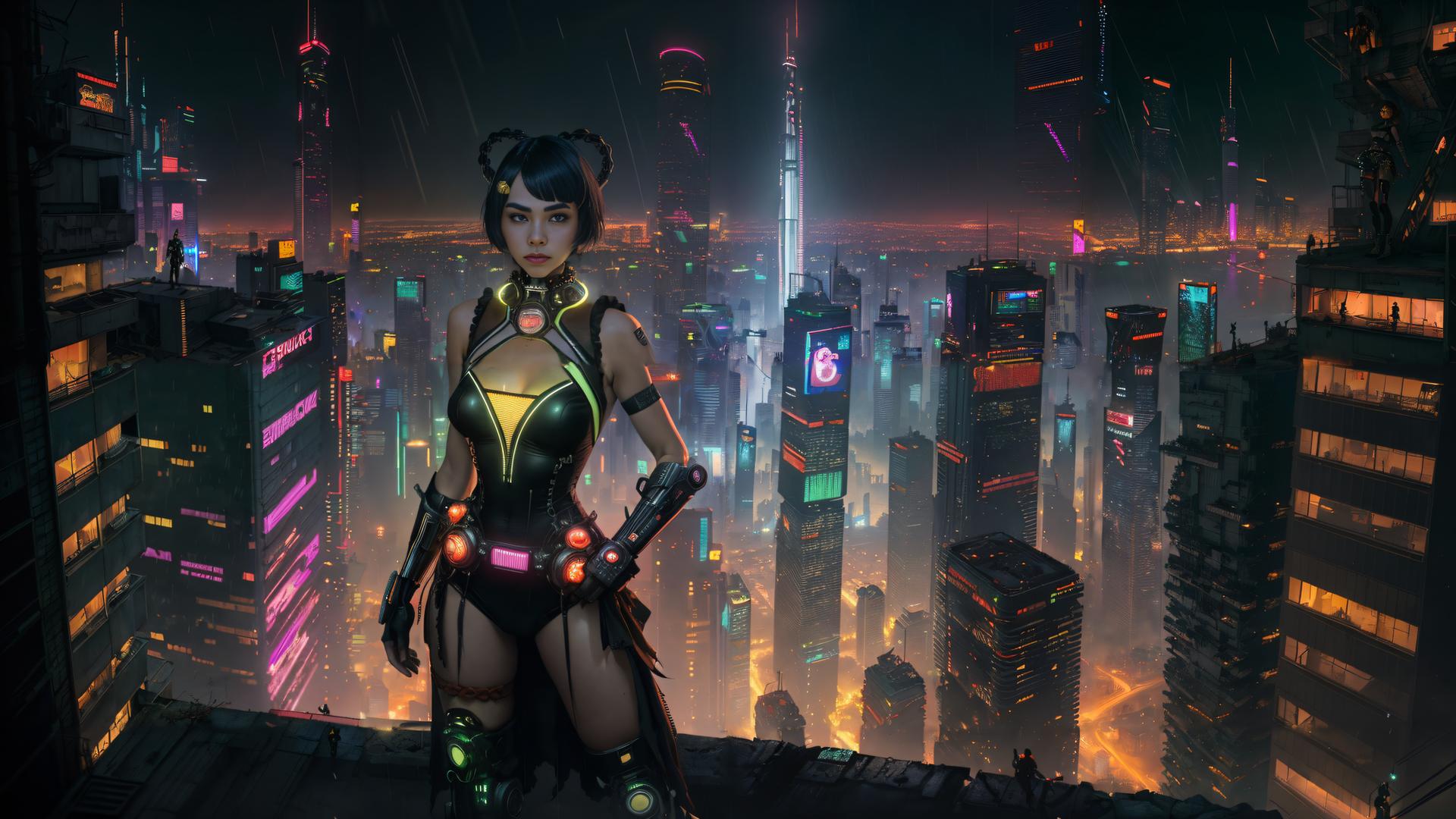 futuristic woman overlooking a city at nighttimes on her rooftop ledge with a glowing helmet on and glowing lights on her skin and chest
