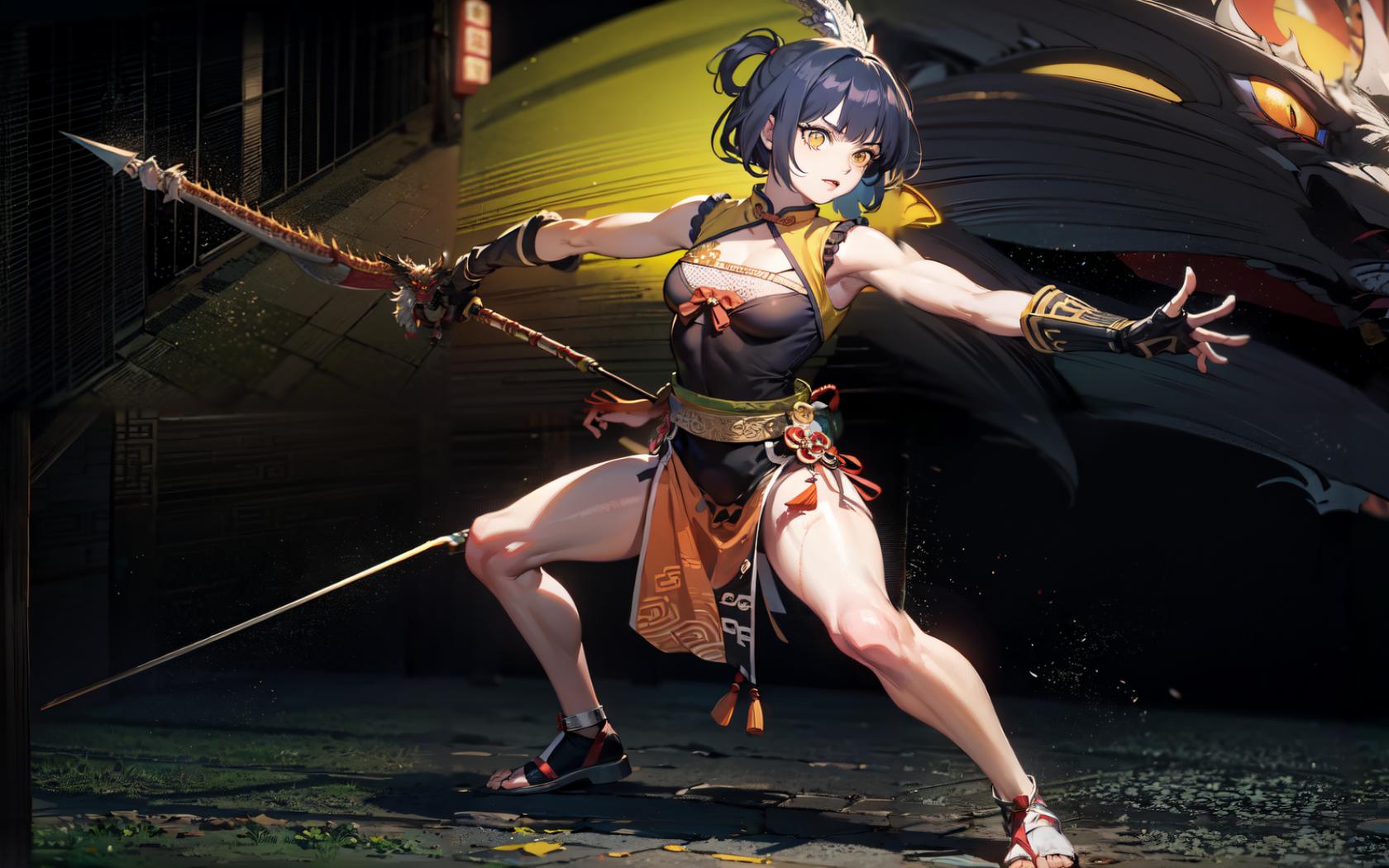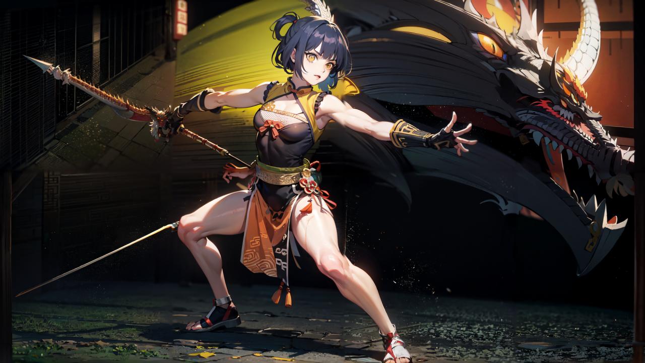 1girl, armpits, bangs, bare shoulders, black gloves, blue hair, braid, china dress, chinese clothes, clothing cutout, dragon , dress, fighting stance, fingerless gloves, gloves, hair rings, holding, holding sword, holding weapon, muscular, open mouth, pelvic curtain, short hair, sleeveless, sleeveless dress, solo, sword, weapon, yellow eyes