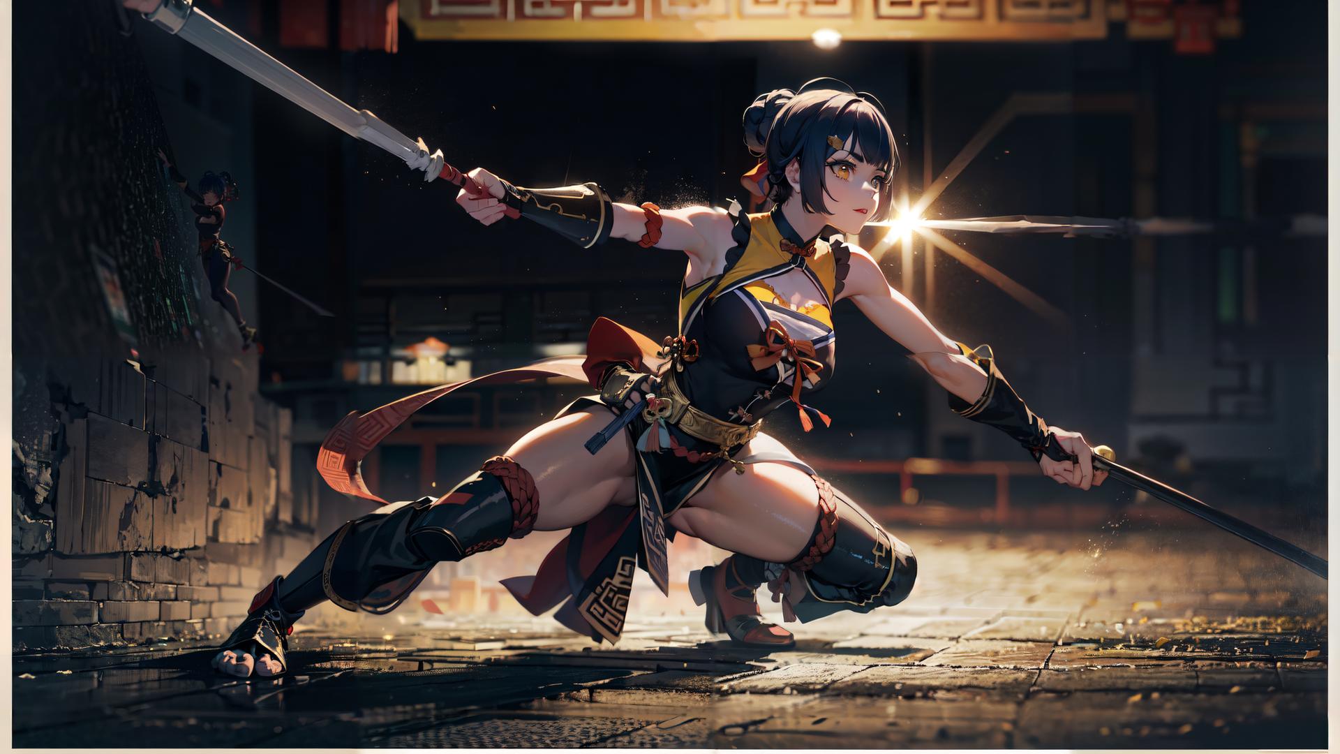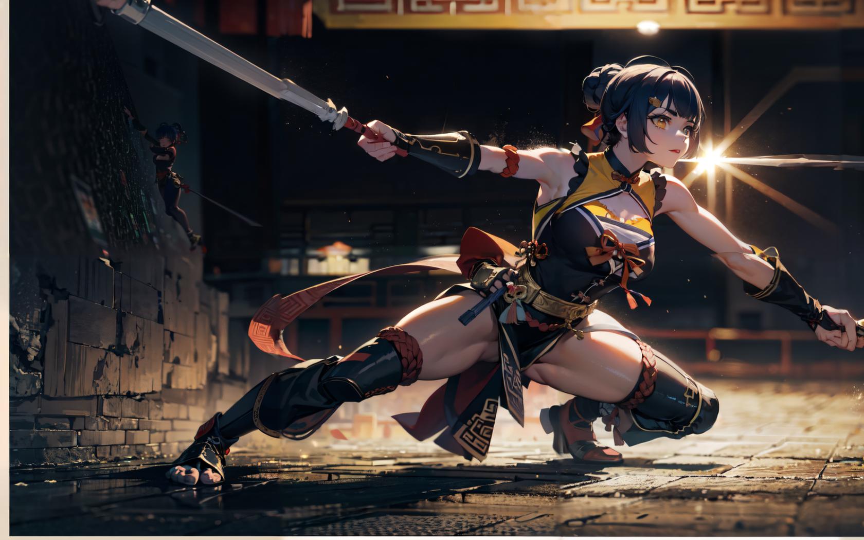 1girl, armpits, bangs, bare shoulders, black dress, black gloves, blue hair, boots, braid, china dress, chinese clothes, clothing cutout, dress, elbow gloves, fingerless gloves, full body, gloves, hair ornament, hairclip, holding, holding polearm , holding weapon, open mouth, pelvic curtain, polearm, short hair, sleeveless, sleeveless dress, solo, spear, squatting, sword, thighhighs, weapon, yellow eyes