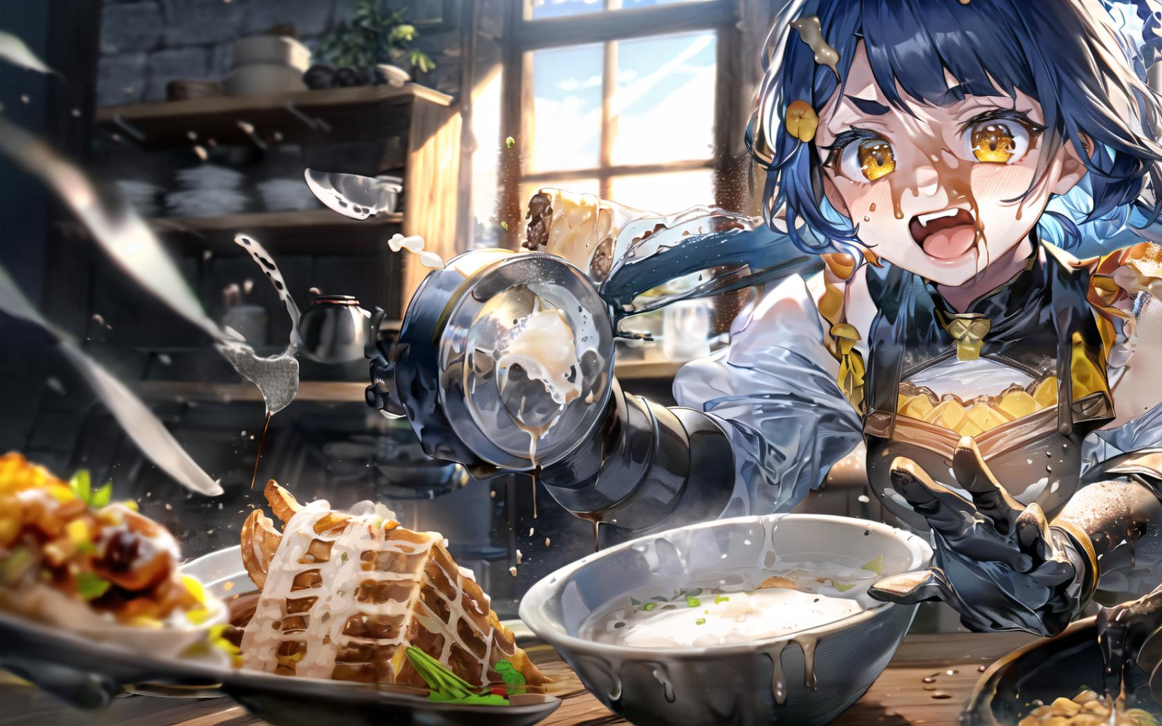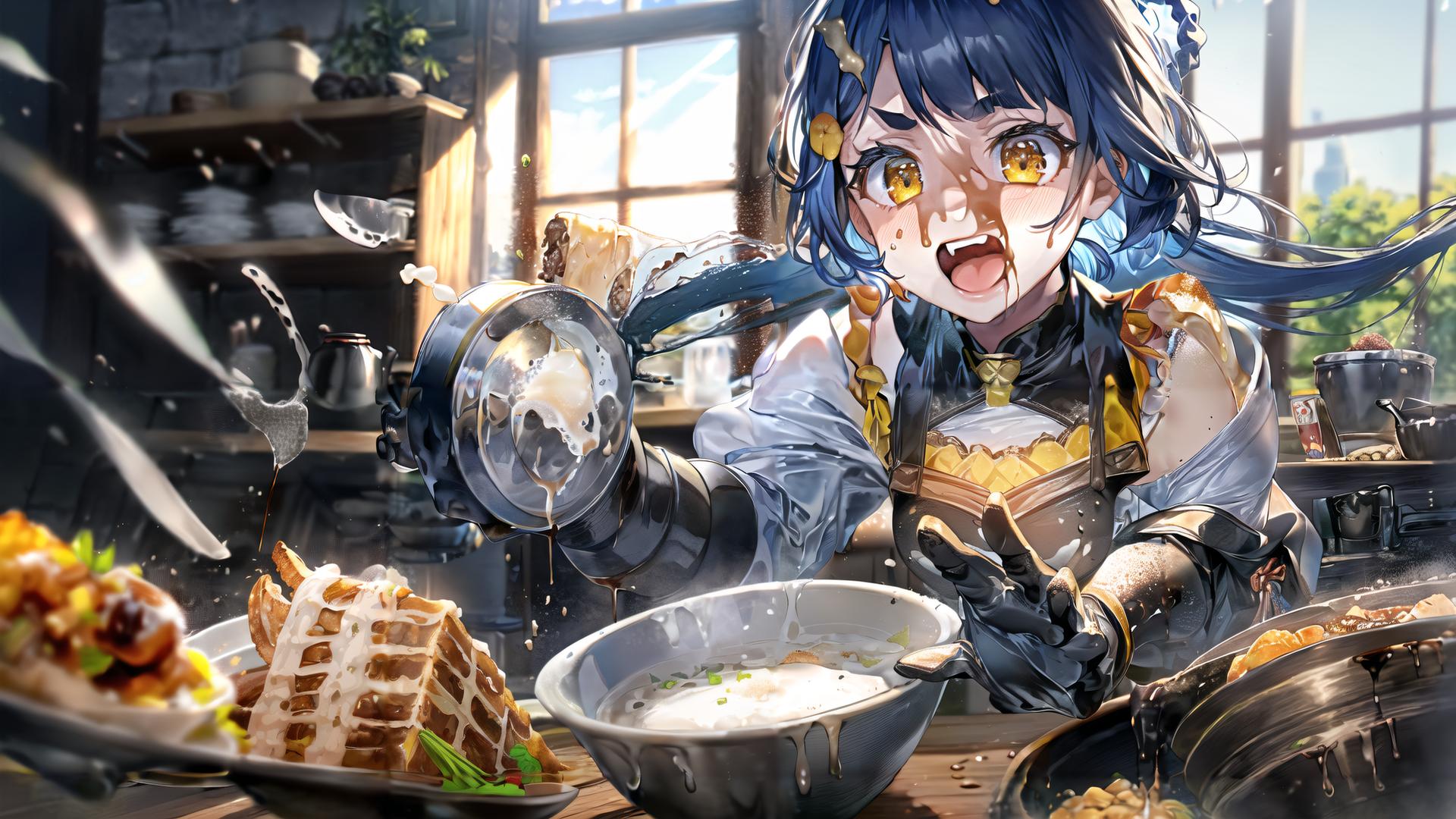 girl in a kitchen making food and yelling behind her table with several servings of fried waffles on the table around her are water