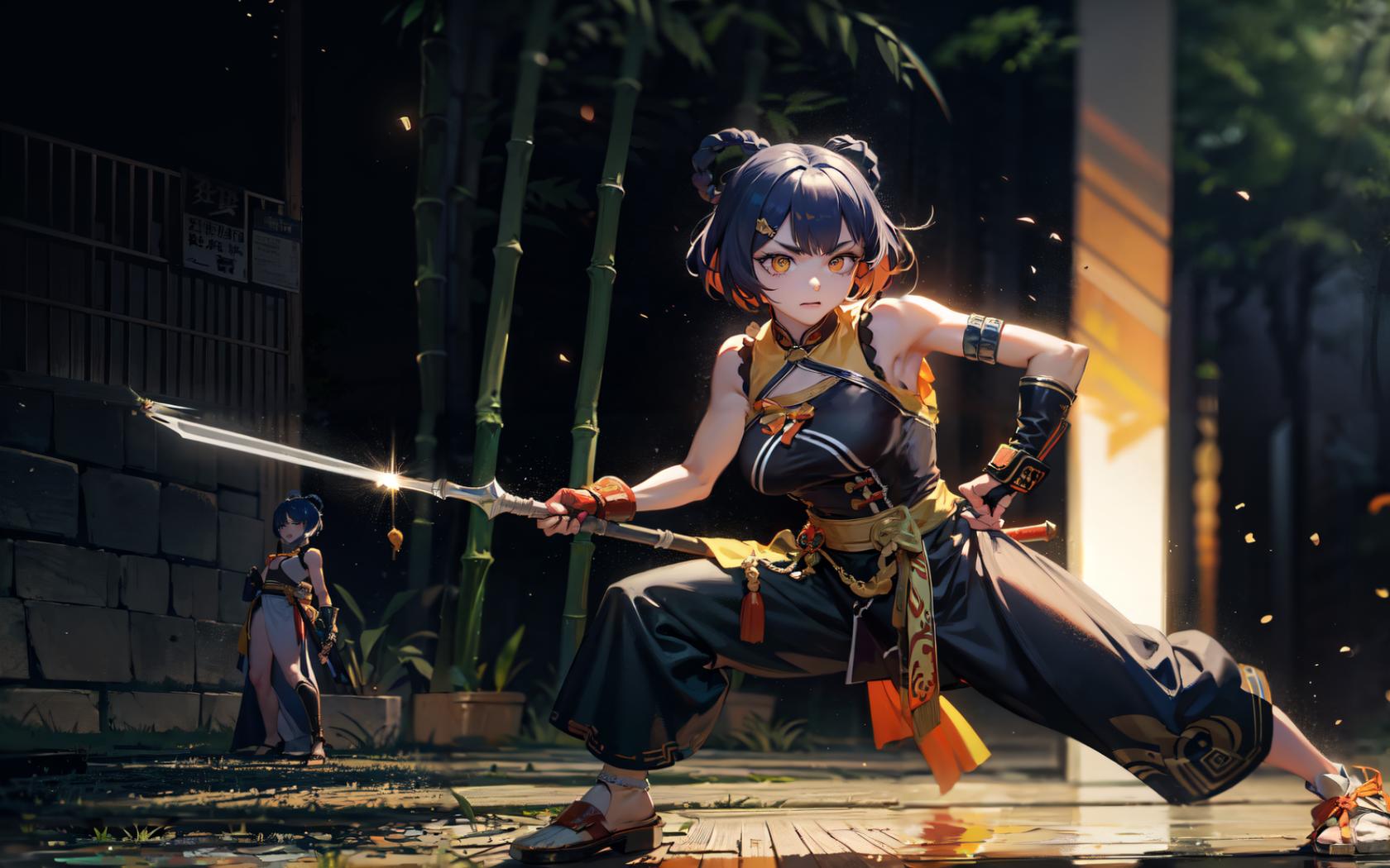 1boy, 1girl, 2girls, armlet, bamboo, bamboo forest , bangs, bare shoulders, black hair, blue hair, braid, china dress, chinese clothes, dress, fingerless gloves, forest, gloves, hair bun, hair ornament, hairclip, holding, holding weapon, looking at viewer, multiple girls, nature, open mouth, outdoors, polearm, short hair, sleeveless, sleeveless dress, sword, tongue, weapon, yellow eyes