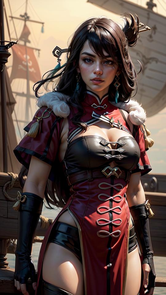 1girl, bangs, black gloves, black thighhighs, brown eyes, brown hair, chinese clothes, cleavage, cleavage cutout, clothing cutout, dress, earrings, fingerless gloves, fur trim, gloves, hair ornament, hair stick, hairpin, jewelry, large breasts, long hair, looking at viewer, pelvic curtain, red dress, ship , shorts, solo, tassel, thighhighs, watercraft