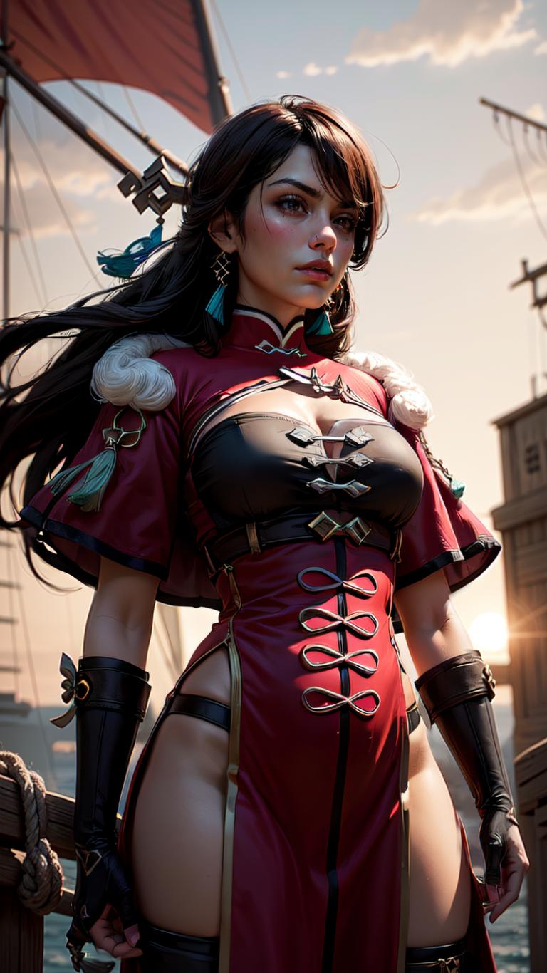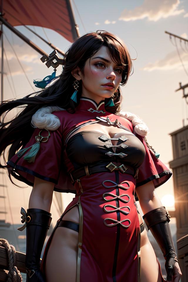 1girl, black gloves, black thighhighs, brown eyes, brown hair, capelet, cleavage, cleavage cutout, clothing cutout, dress, earrings, eyepatch, fingerless gloves, fur trim, gloves, hair ornament, hair over one eye, hair stick, hairpin, jewelry, large breasts, long hair, looking to the side, outdoors, pelvic curtain, red capelet, red dress, ship , sky, solo, thighhighs, watercraft