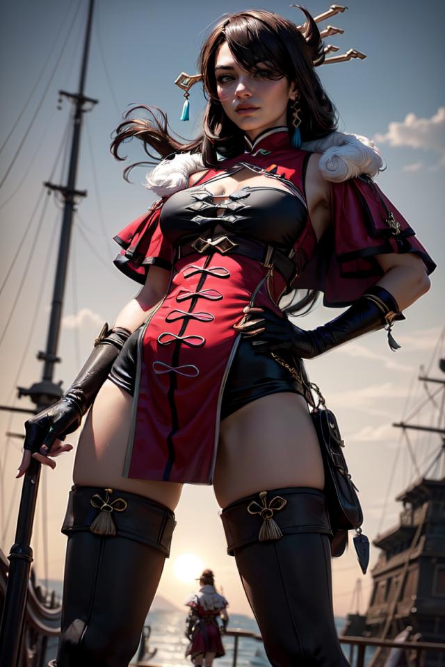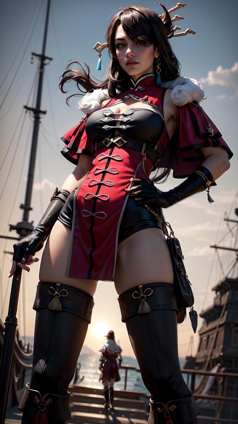 1boy, 1girl, black gloves, boots, brown eyes, brown hair, capelet, cleavage, cloud, dress, earrings, eyepatch, fingerless gloves, fur trim, gloves, hair ornament, hair over one eye, hair stick, hairpin, hand on hip, holding, jewelry, long hair, looking at viewer, outdoors, pelvic curtain, red capelet, red dress, ship , sky, solo focus, standing, sword, thighhighs, watercraft, weapon