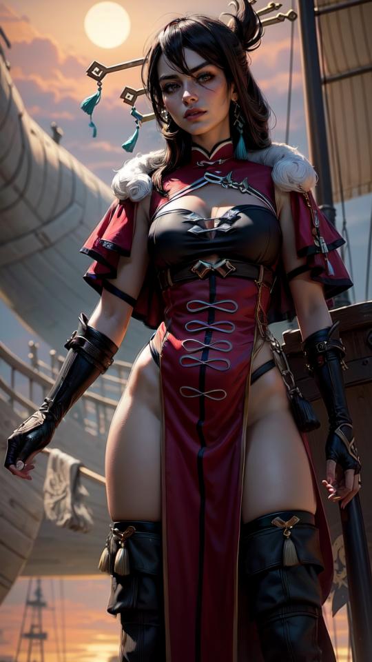 1girl, black gloves, boots, brown eyes, brown hair, capelet, cleavage, cleavage cutout, clothing cutout, dress, earrings, eyepatch, fingerless gloves, gloves, hair ornament, hair stick, hairpin, jewelry, large breasts, long hair, looking at viewer, medium breasts, no panties, outdoors, parted lips, pelvic curtain, red capelet, red dress, ship , sky, solo, thigh boots, thighhighs, watercraft