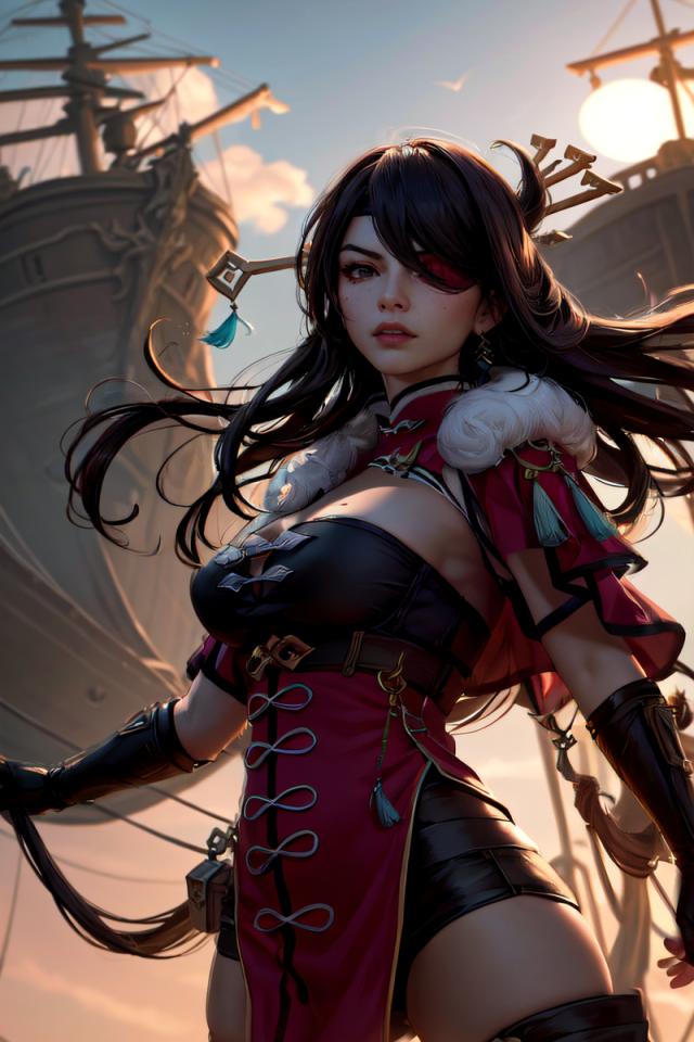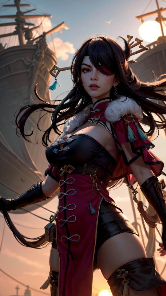 1girl, black gloves, boots, brown hair, capelet, chinese clothes, cleavage, dress, earrings, eyepatch, fingerless gloves, gloves, hair ornament, hair stick, hairpin, jewelry, large breasts, long hair, looking at viewer, mast , mole, one eye covered, outdoors, parted lips, pelvic curtain, power lines, ship, sky, solo, tassel, thigh boots, thighhighs, warship, watercraft