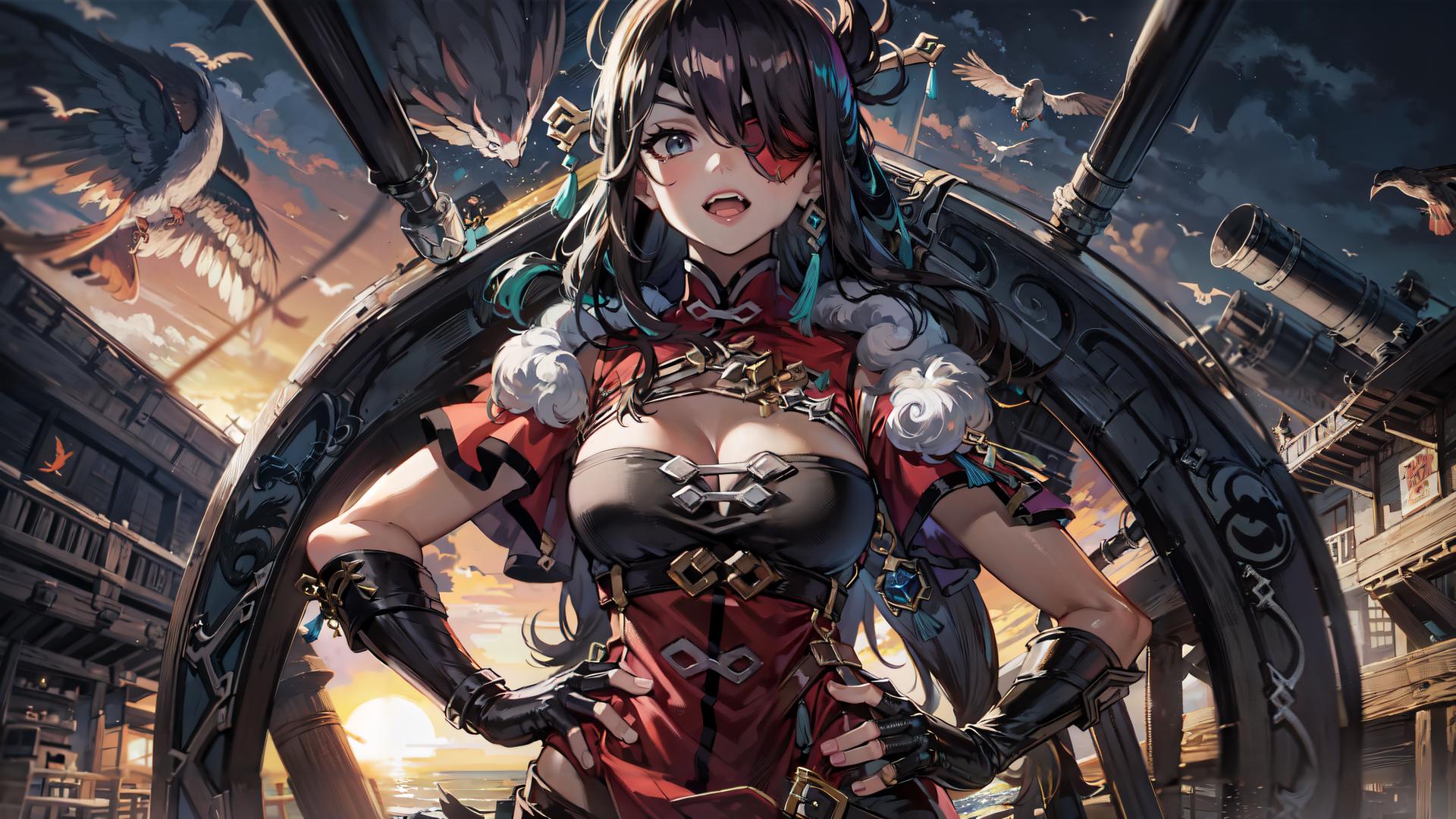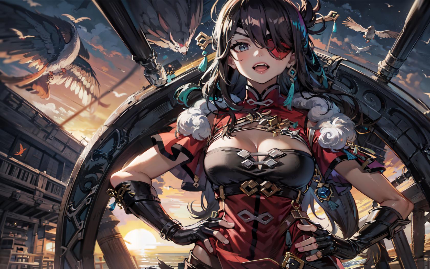 1girl, bangs, bird, black gloves, black hair, brown hair, capelet, cleavage, cloud, dress, earrings, eyepatch, fingerless gloves, gloves, hair ornament, hair over one eye, hair stick, hairpin, hands on hips, jewelry, large breasts, long hair, looking at viewer, one eye covered, open mouth, outdoors, red capelet, red dress, ship , sky, smile, solo, upper body, watercraft