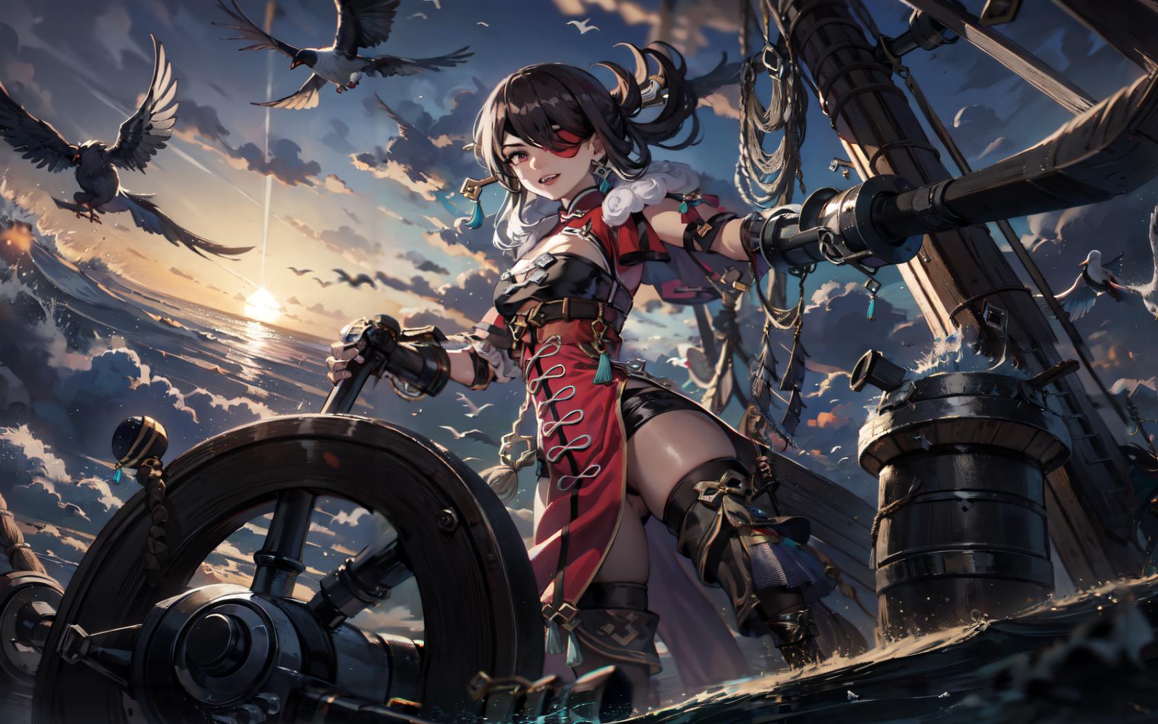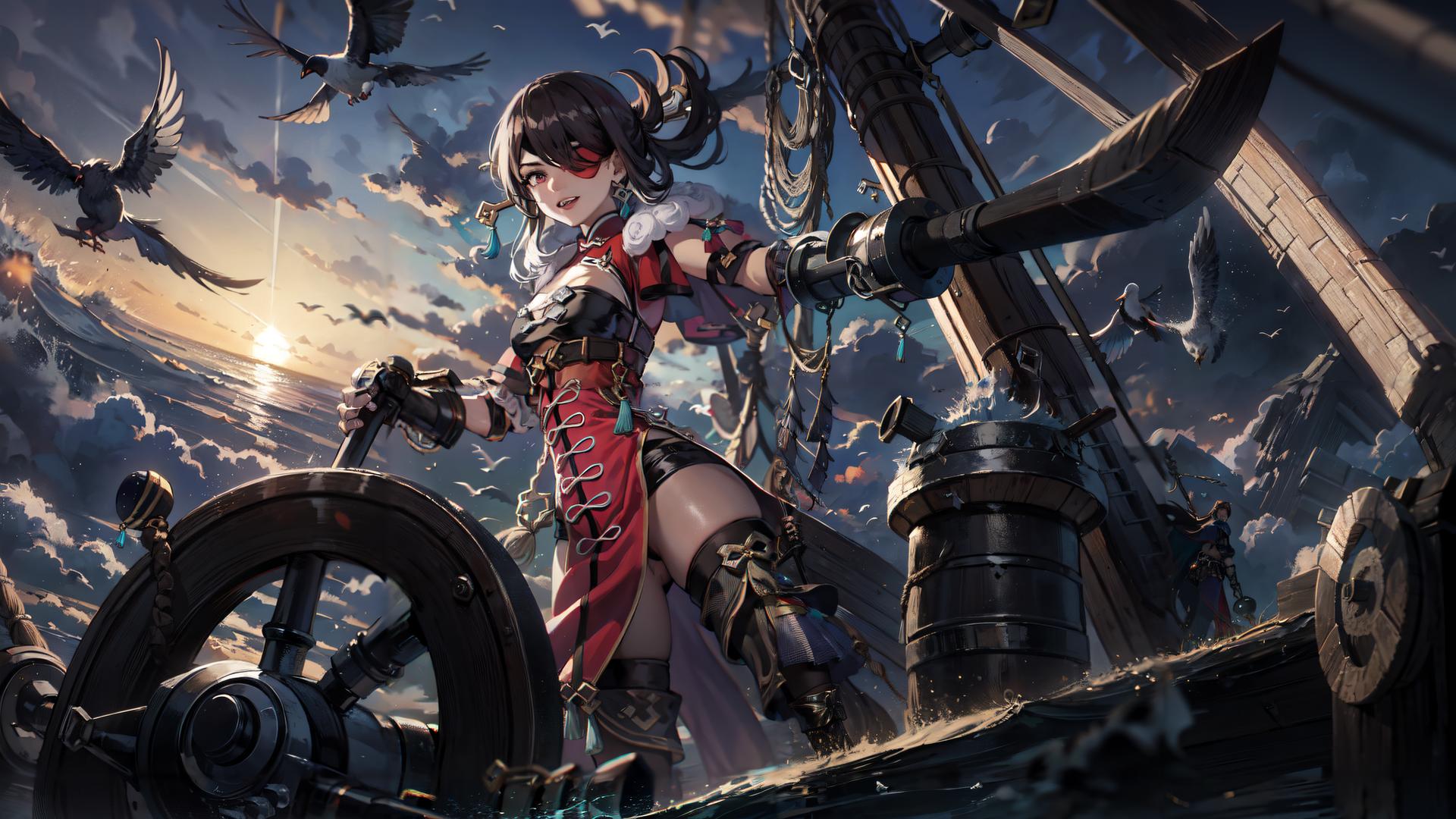 1girl, bird, black gloves, black hair, boots, brown hair, capelet, cleavage, cloud, dress, earrings, eyepatch, fingerless gloves, fur trim, gloves, hair ornament, hair over one eye, hair stick, hairpin, holding, holding weapon, jewelry, large breasts, long hair, looking at viewer, ocean, one eye covered, open mouth, outdoors, pelvic curtain, red eyes, seagull , ship, sky, smile, solo, sunlight, sunset, sword, thigh boots, thighhighs, water, watercraft, weapon