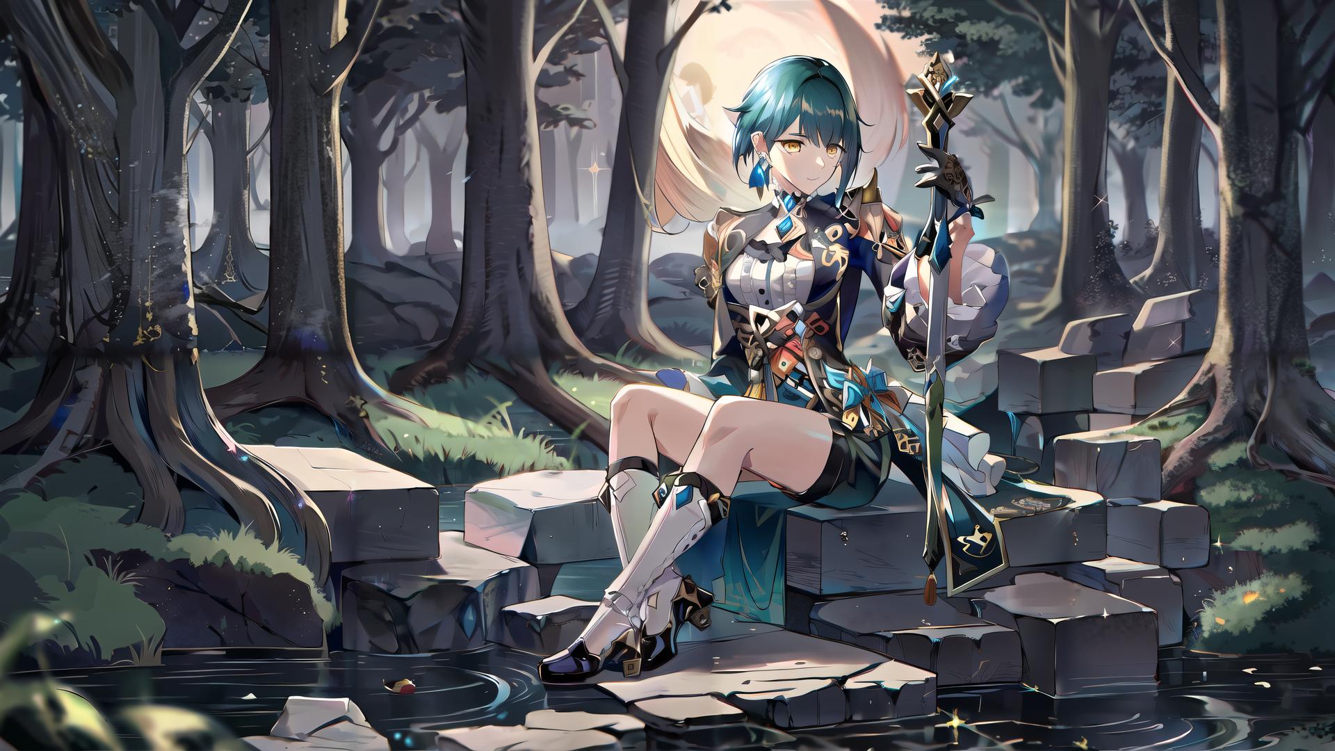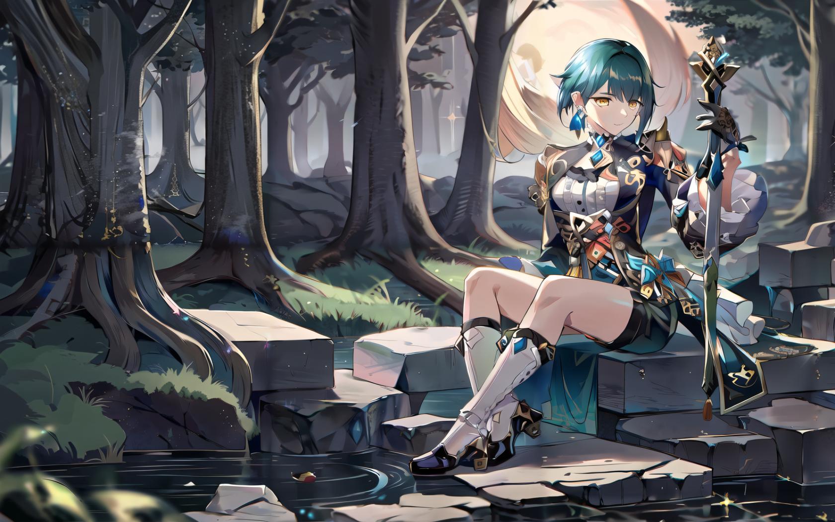 1boy, bangs, black gloves, blue hair, blue shorts, boots, closed mouth, earrings, forest, frilled sleeves, frills, full body, gloves, grass, hair between eyes, high heel boots, high heels, holding, instrument, jewelry, long sleeves, looking at viewer, male focus, nature, outdoors, shirt, short hair, shorts, single earring, sitting, socks, solo, stairs, sword, tassel, tassel earrings , tree, vision (genshin impact), water, weapon, yellow eyes