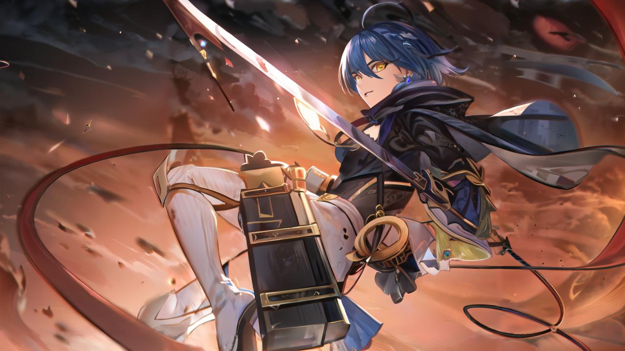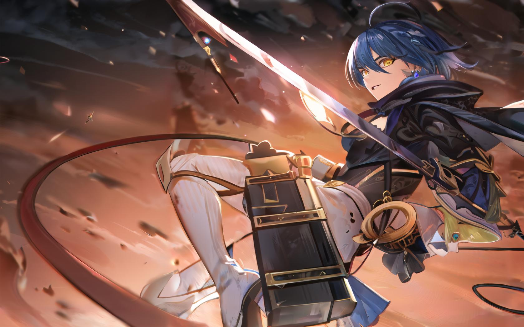 1girl, ahoge, armor, blue hair, boots, earrings, gloves, holding, holding sword , holding weapon, jewelry, looking at viewer, scarf, short hair, solo, sword, weapon, yellow eyes