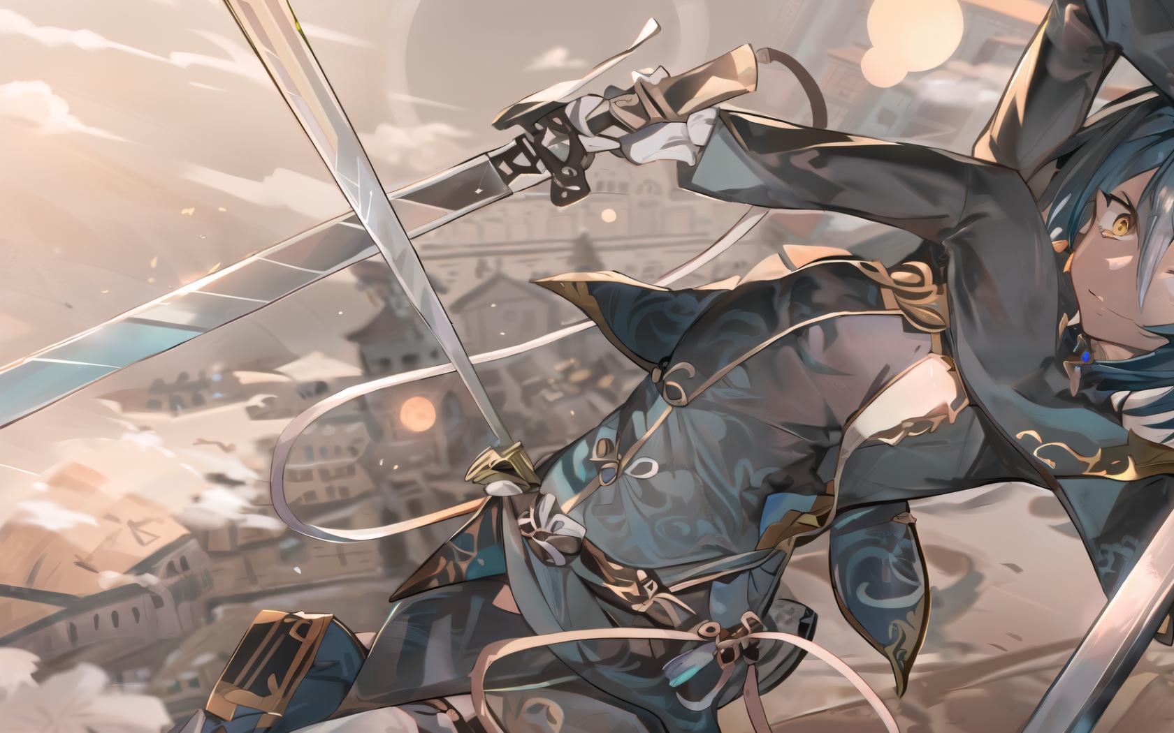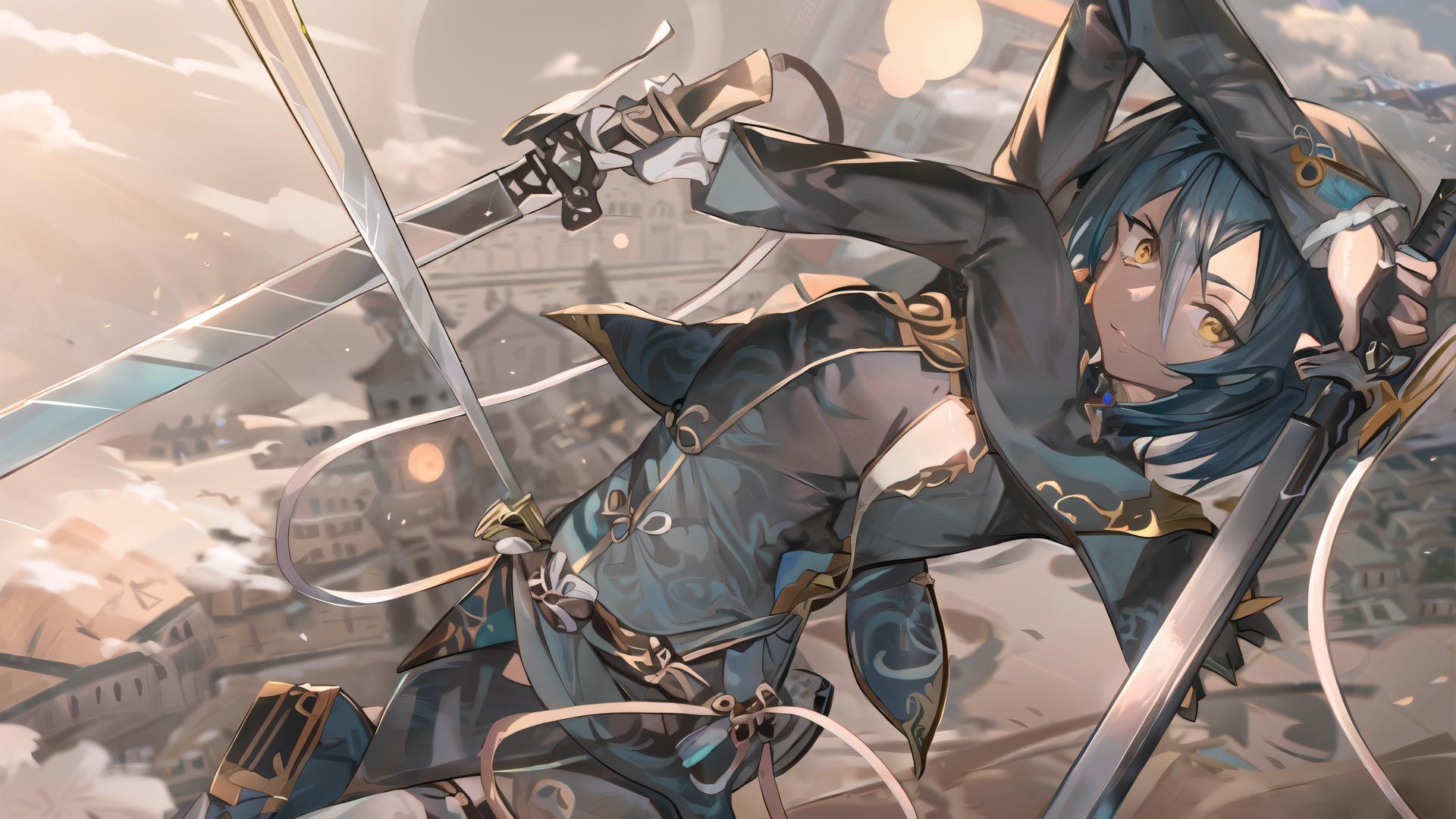 1girl, arm up, bangs, blue hair, building, closed mouth, dual wielding , earrings, frilled sleeves, frills, gloves, hair between eyes, holding, holding sword, holding weapon, jewelry, long sleeves, looking at viewer, outdoors, shirt, short hair, solo, sword, weapon, yellow eyes