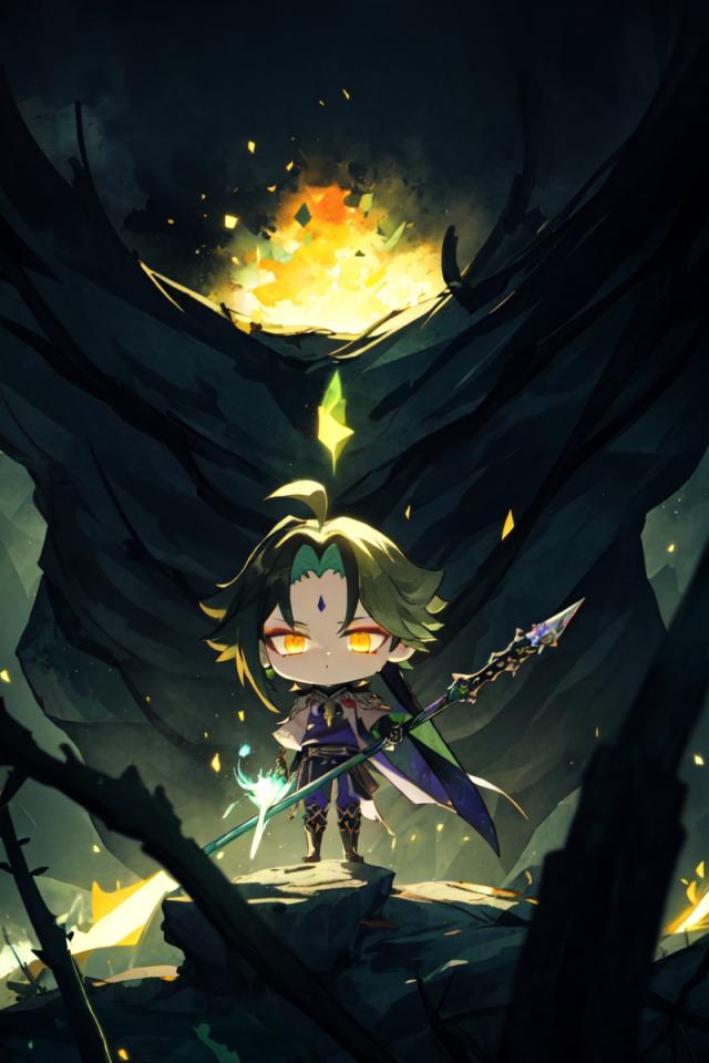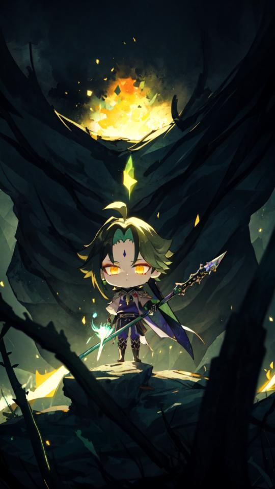 1boy, ahoge, arm tattoo, bangs, bead necklace , beads, black hair, chibi, closed mouth, facial mark, forehead mark, gloves, green hair, holding, holding polearm, holding weapon, jewelry, looking at viewer, male focus, multicolored hair, necklace, polearm, solo, spear, standing, tattoo, weapon, yellow eyes
