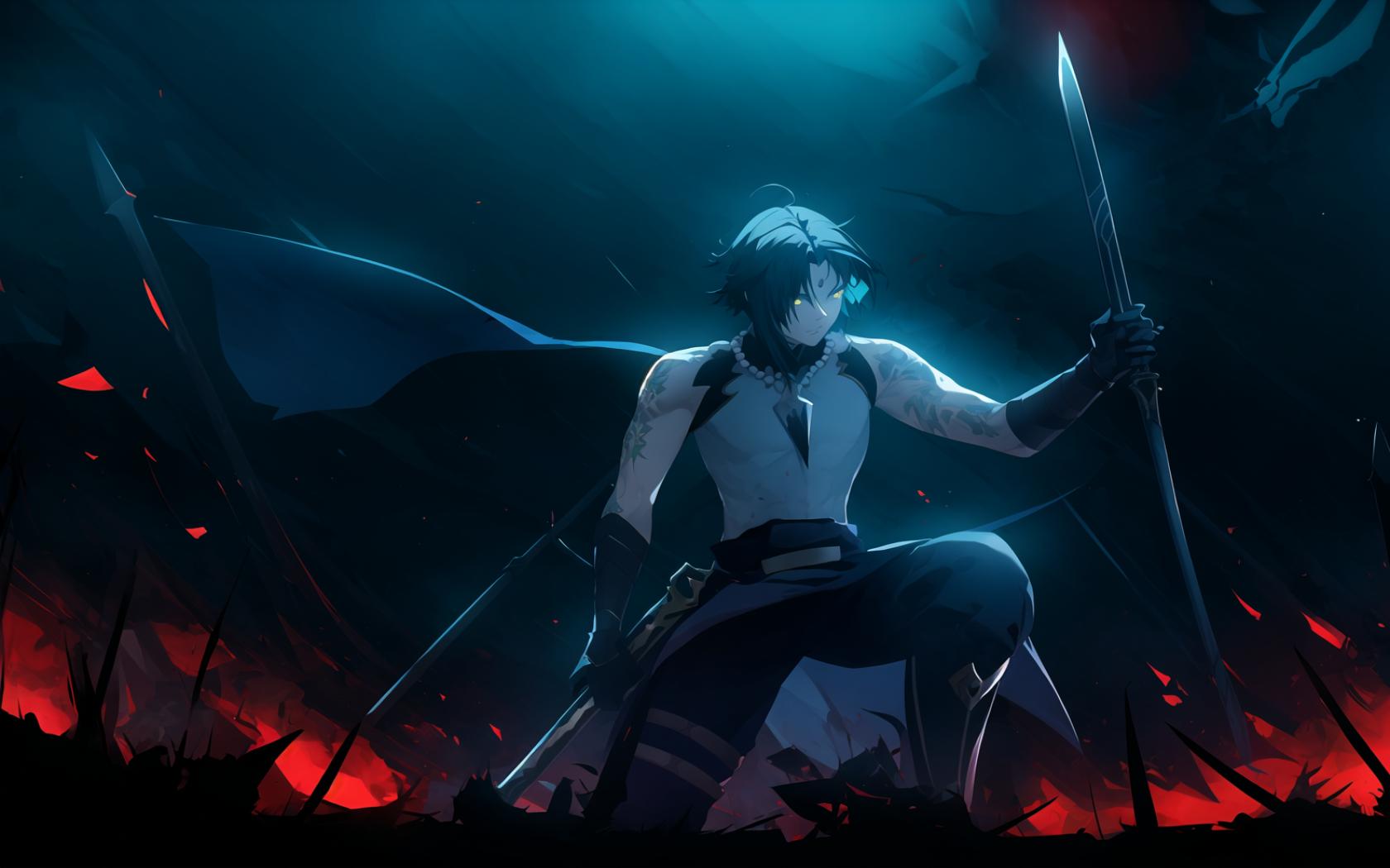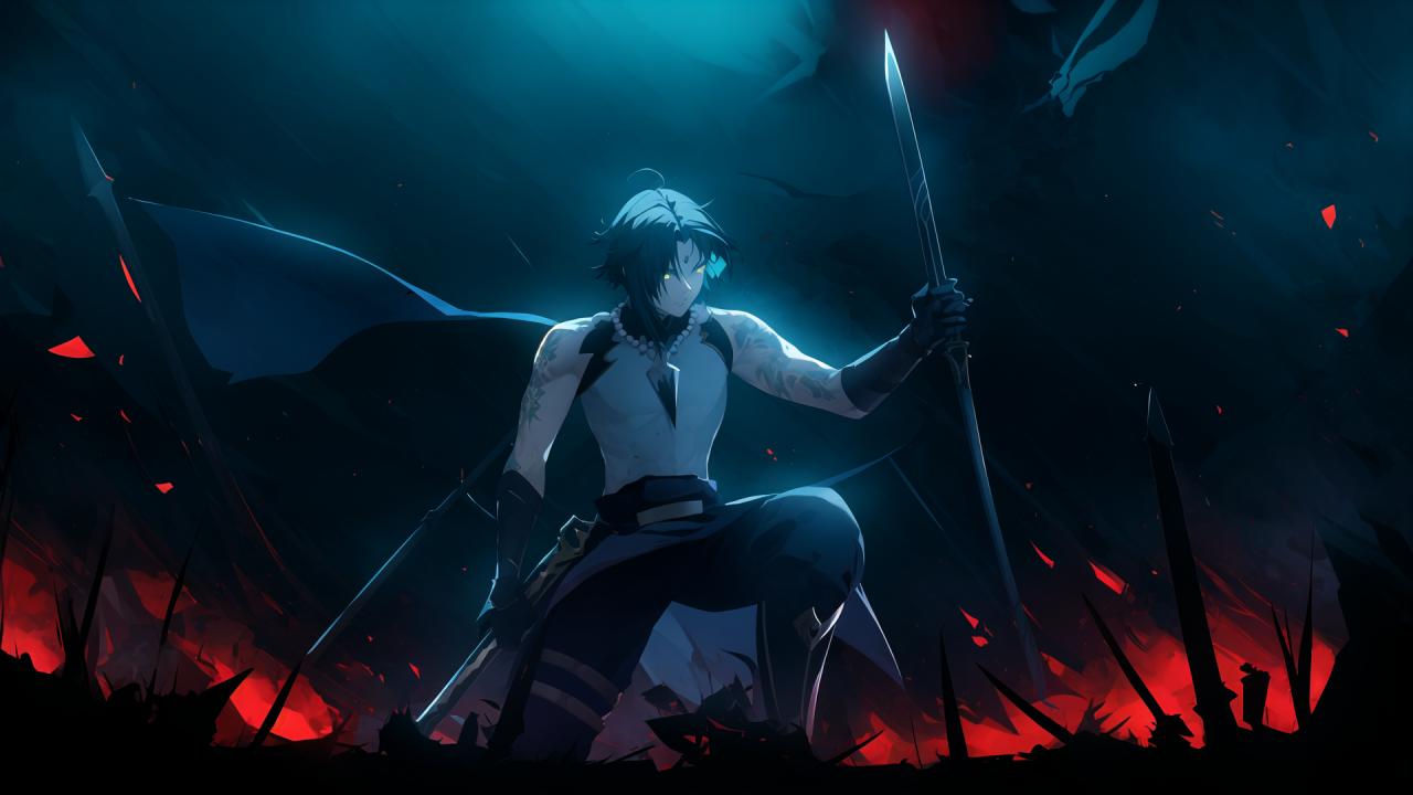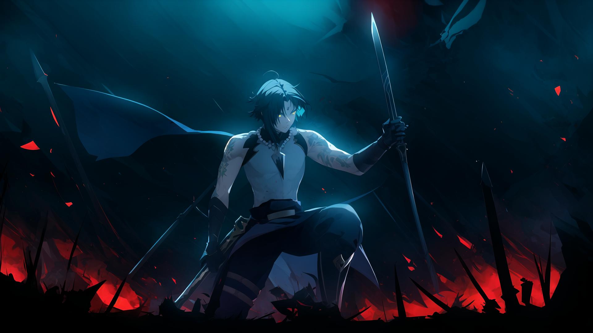 1boy, ahoge, arm tattoo, armor, bead necklace, beads, black gloves, black hair, closed mouth, gloves, green hair, holding, holding polearm, holding weapon, jewelry, male focus, mask, necklace, one knee, outdoors, pants, planted , polearm, solo, spear, tattoo, weapon, yellow eyes