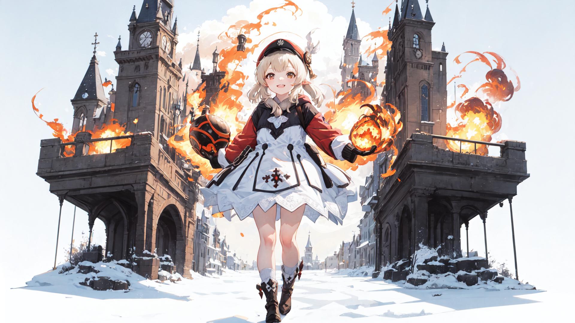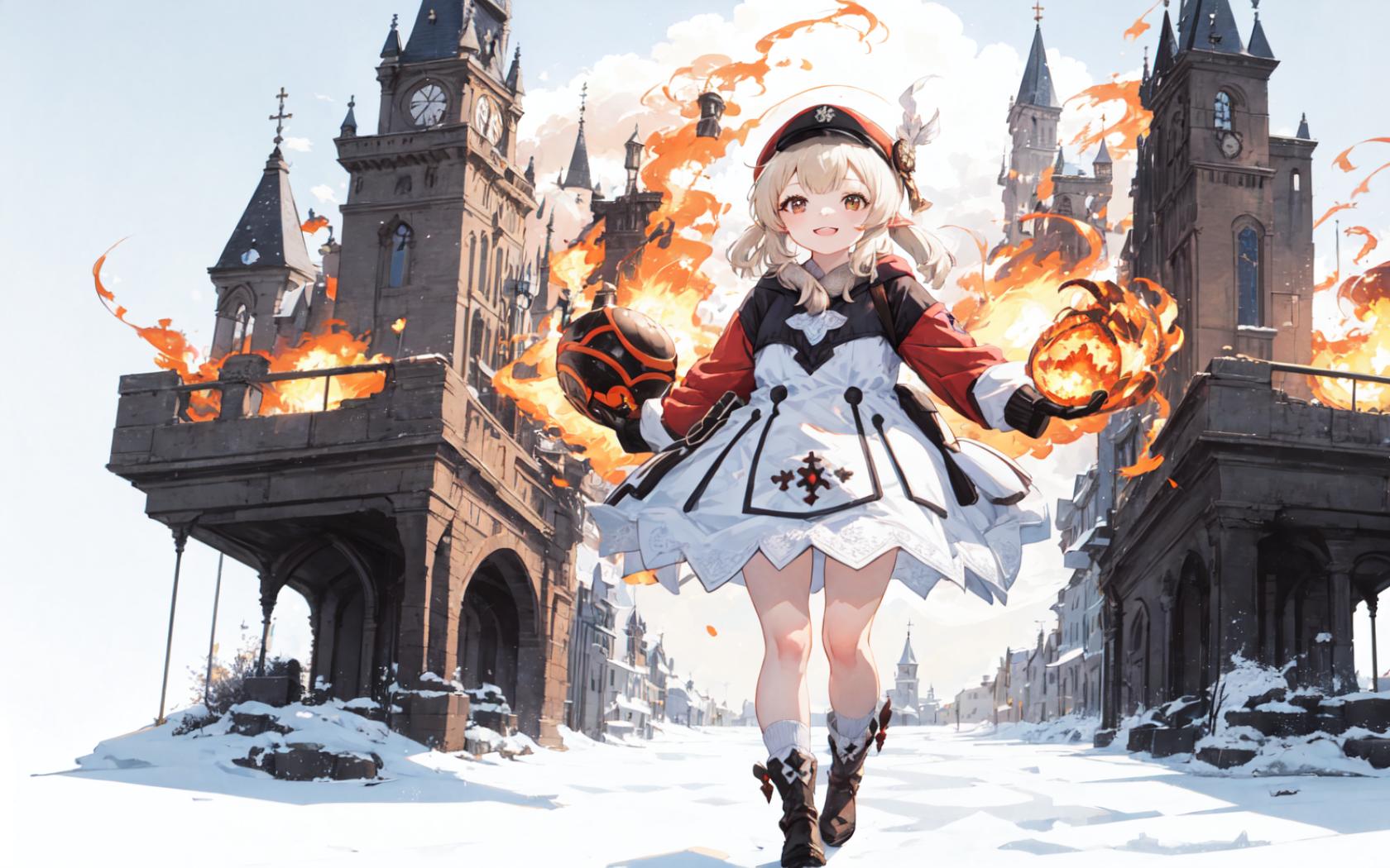 1girl, :d, ahoge, alternate costume, bangs, blonde hair, boots, brown gloves, building, castle, clock, clock tower , clover print, dress, explosion, fire, full body, gloves, hat, light brown hair, long hair, long sleeves, looking at viewer, low twintails, open mouth, orange eyes, outdoors, pointy ears, red headwear, sidelocks, sky, smile, socks, solo, standing, tower, twintails, white dress