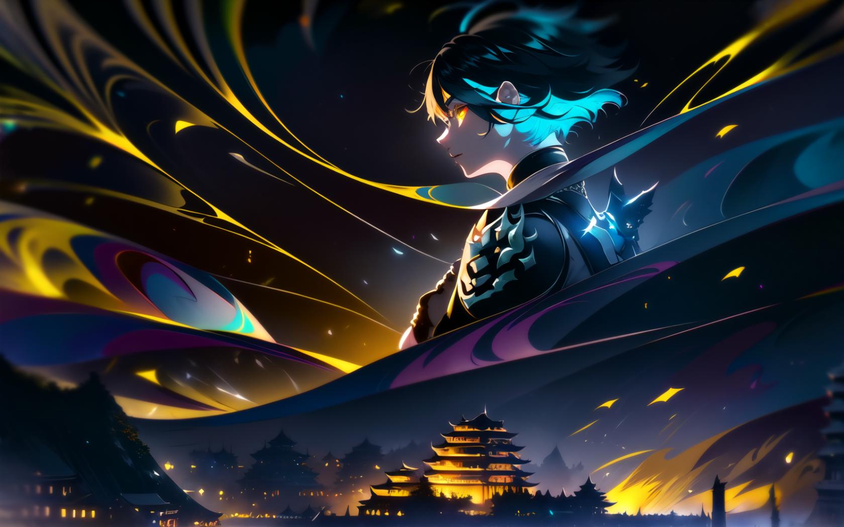 | Prompt | <lora:beautiful-eyes:0.6> (epic:1.5, perfect artwork), best quality,dynamic pose,sharp focus,(8k), (4k),(Masterpiece), (Best Quality), fantasy, extremely detailed, intricate, (highly detailed:1.4), hyper detailed, (perfect face), illustration,soft lighting,(specular lighting:1.4), Ultra detailed fantasy environment, clearly worked out detail, intricate, cinematic,(depth of field), (dark fantasy art:1.8), (anime art:1.2), <lora:Genshin_Xiao_AP_v9:1>,1boy, male focus, yellow eyes,official, (solo:1.4), ((muscular)), mask, (holding mask:1.2), (twilight, sunset),(orange fireworks),wind,autumn, fall, aurora borealis, ((standing top of a medieval chinese mansion)), (medieval chinese harbor below:1.3), (medieval boats), trees, leaves in the wind, crossed arms, serious, focused, cowboy shot, |