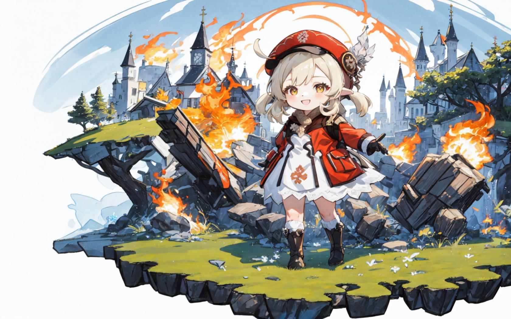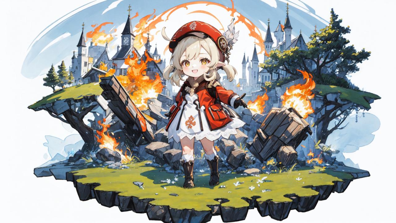 1girl, :d, ahoge, backpack, bag, bangs, black footwear, blonde hair, boots, brown footwear, brown gloves, building, cabbie hat, dress, fire, full body, gloves, hair between eyes, hat, hat feather , jacket, knee boots, long sleeves, looking at viewer, low twintails, open mouth, outdoors, pointy ears, puffy long sleeves, red dress, red headwear, smile, socks, solo, standing, tree, twintails, upper teeth only, white dress