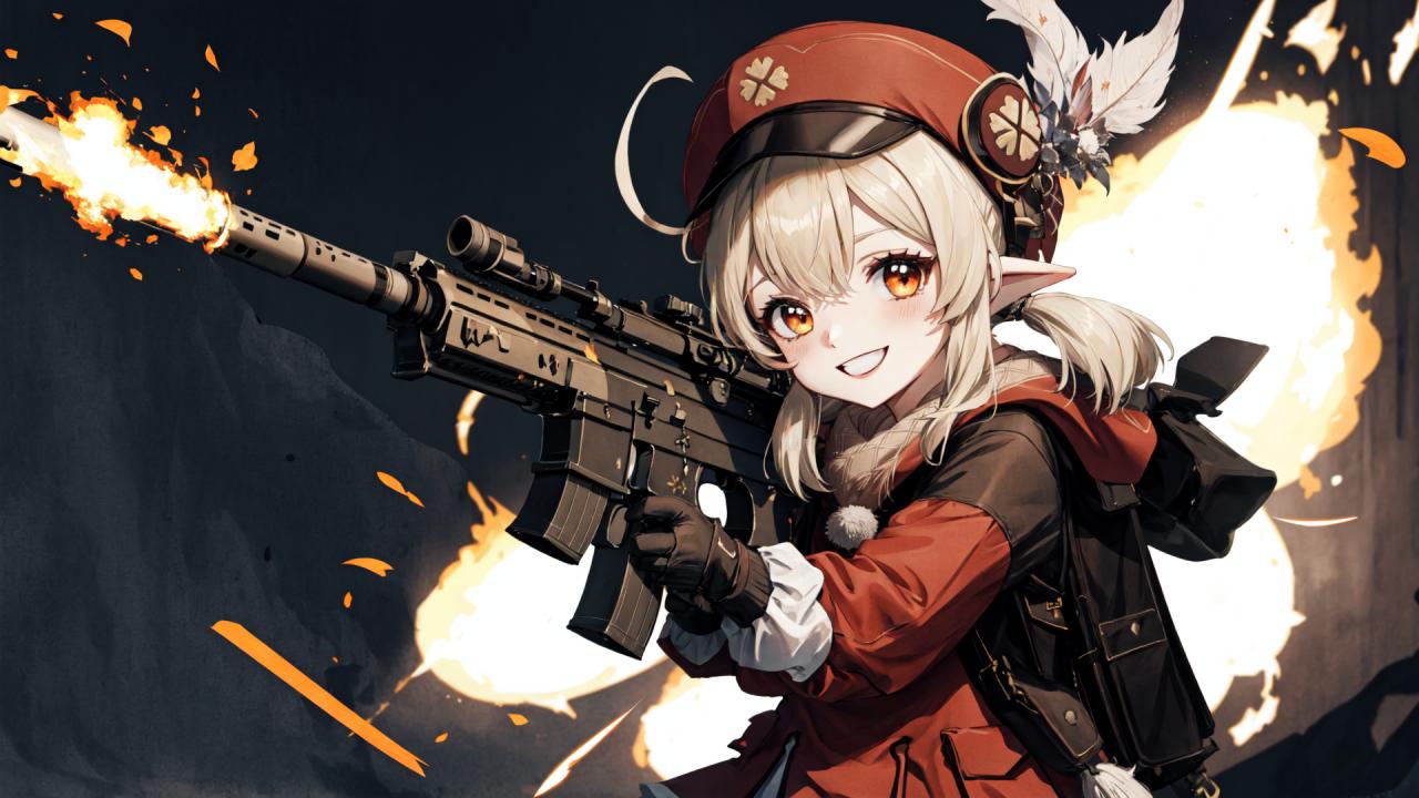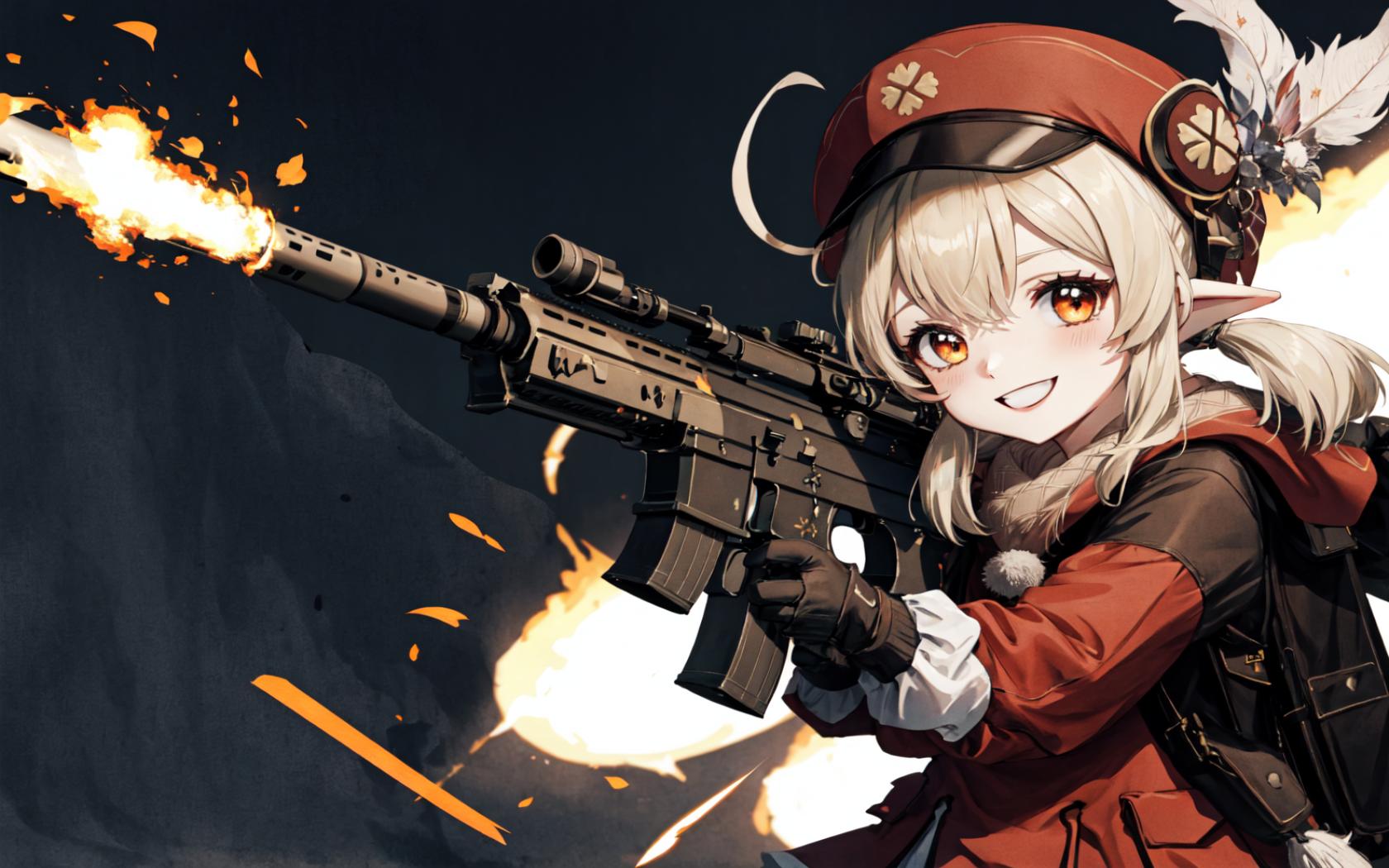 1girl, ahoge, backpack, bag, bangs, blonde hair, brown gloves, cabbie hat, dress, explosion, feathers, firing , gloves, grin, gun, hair between eyes, hat, hat feather, holding, holding gun, holding weapon, long sleeves, looking at viewer, low twintails, pointy ears, red dress, red eyes, red headwear, smile, solo, twintails, upper body, weapon