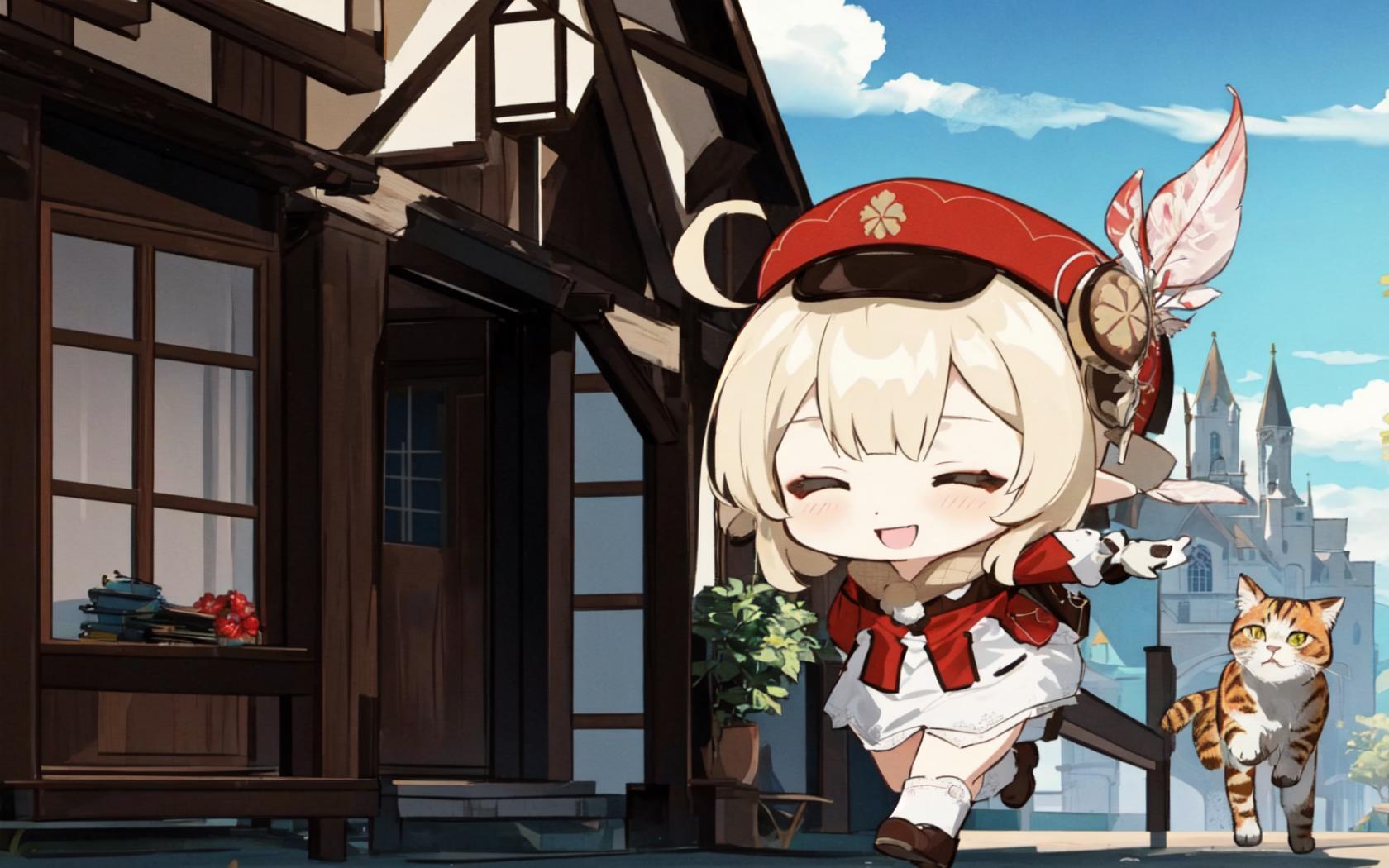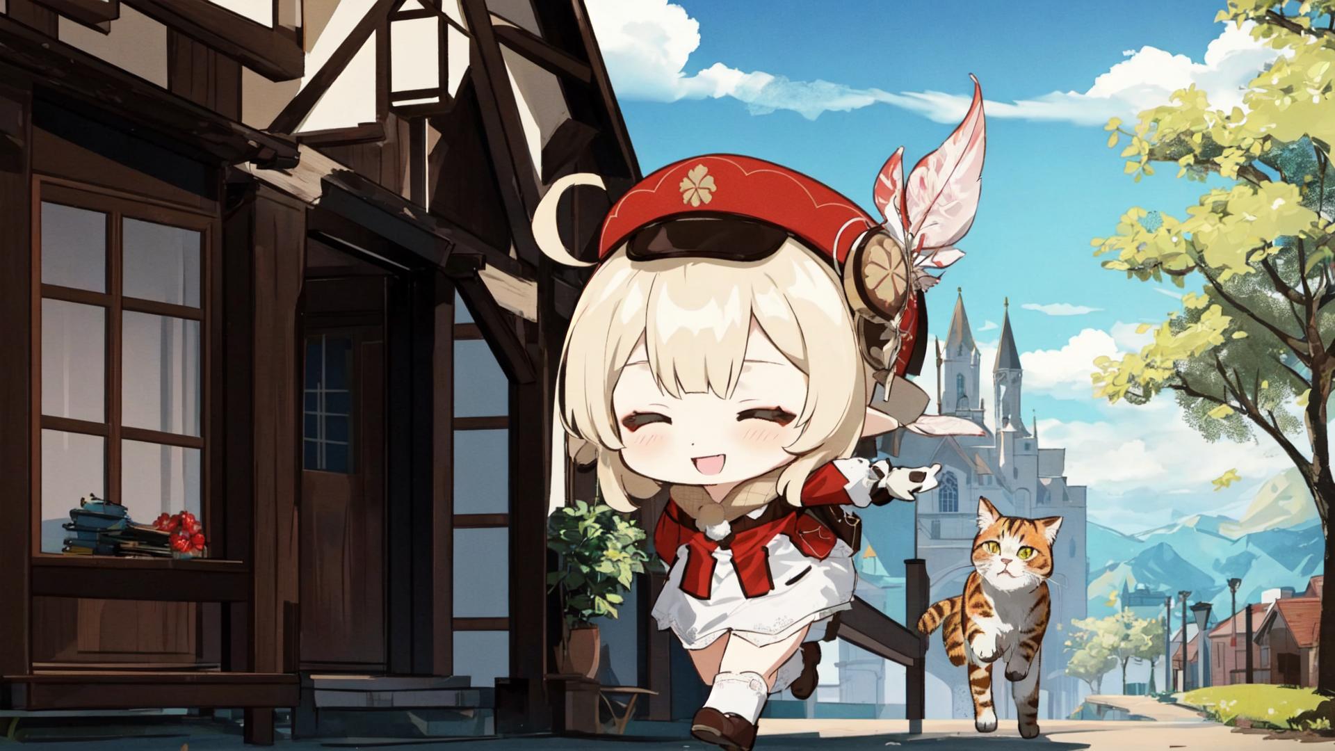 1girl, :d, ^_^, ^o^, ahoge, backpack, bag, bag charm, bangs, bloomers, blue sky, brown footwear, brown gloves, brown scarf, building, cabbie hat, cat, chibi, closed eyes, cloud, cloudy sky, clover print , coat, day, gloves, hair between eyes, hat, hat feather, hat ornament, kneehighs, light brown hair, long hair, long sleeves, low twintails, open mouth, outdoors, outstretched arms, pocket, pointy ears, randoseru, red coat, red headwear, running, scarf, sidelocks, sky, smile, socks, solo, spread arms, tree, twintails