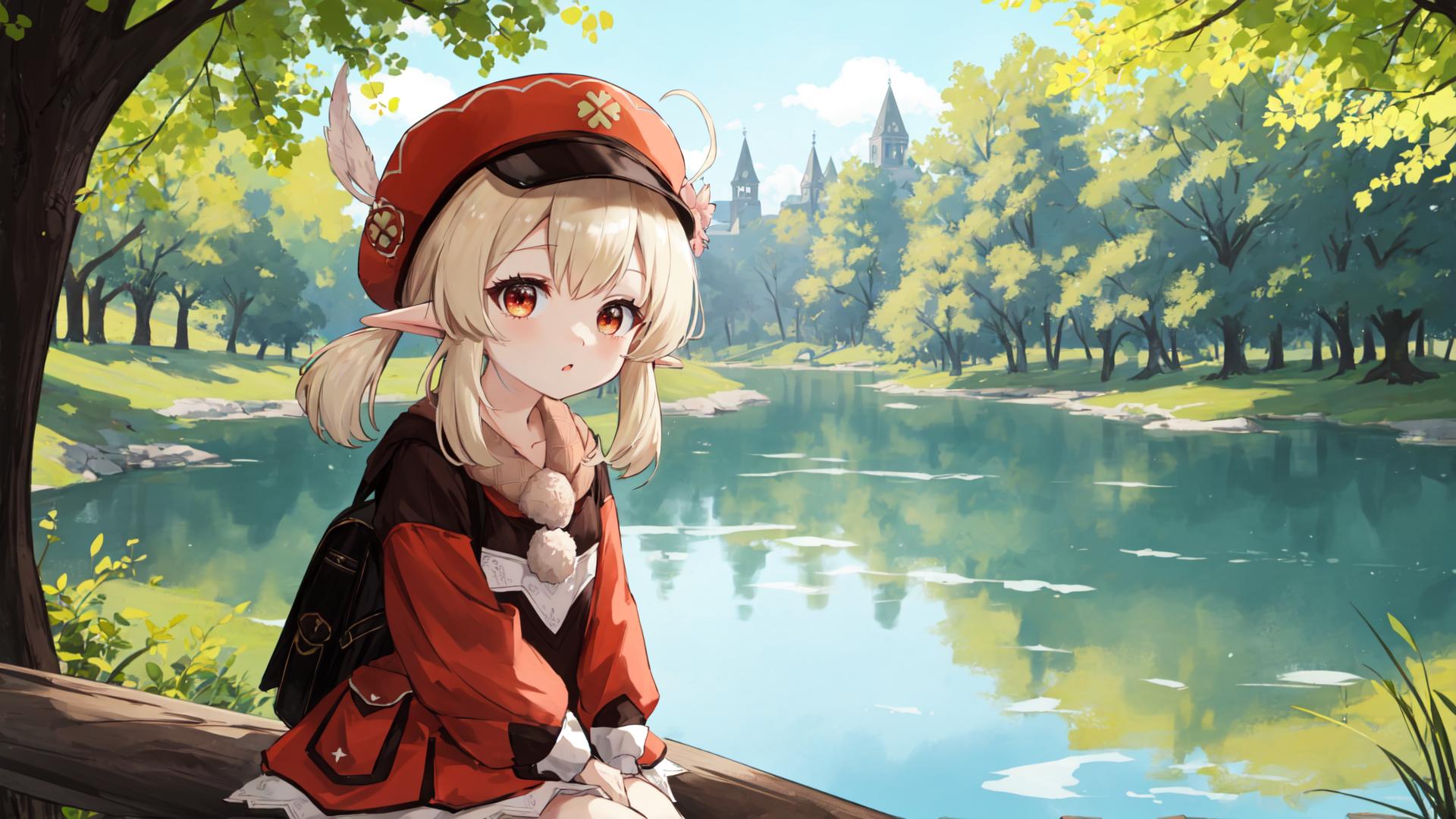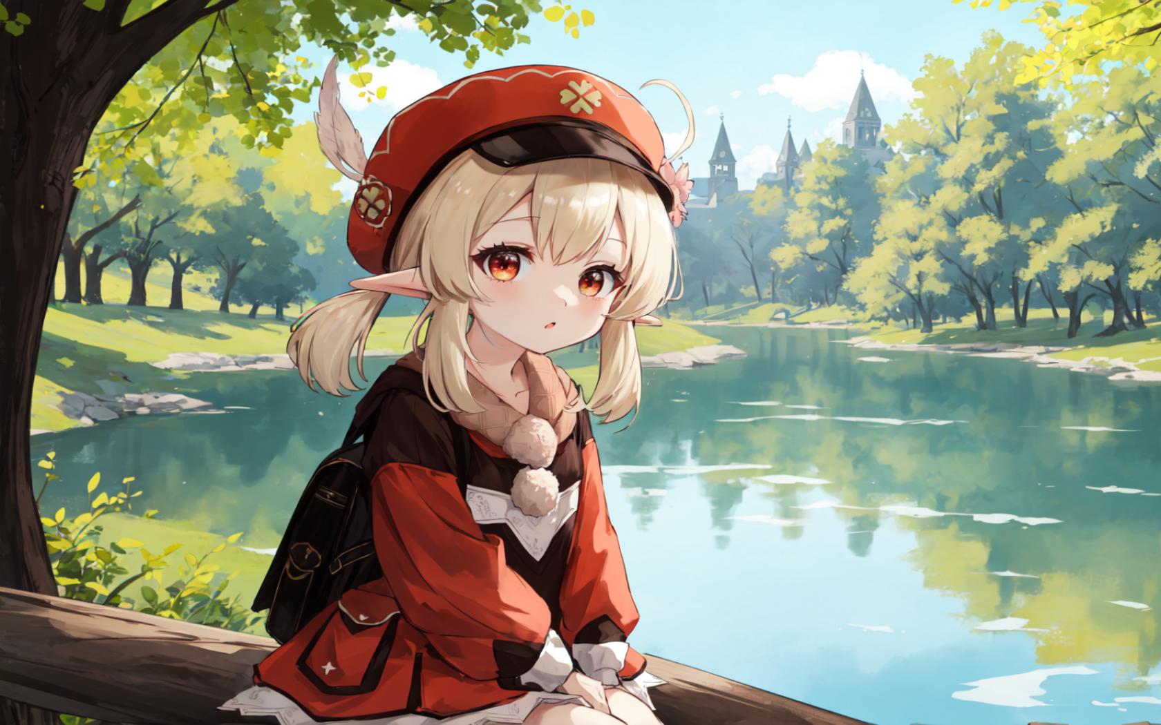 1girl, ahoge, backpack, bag, bag charm, bangs, blonde hair, cabbie hat, clover print , day, dress, forest, grass, hair between eyes, hat, hat feather, lake, light brown hair, long hair, long sleeves, looking at viewer, low twintails, nature, orange eyes, outdoors, parted lips, pointy ears, randoseru, red dress, red eyes, red headwear, reflection, sidelocks, sitting, sky, solo, tree, twintails, water